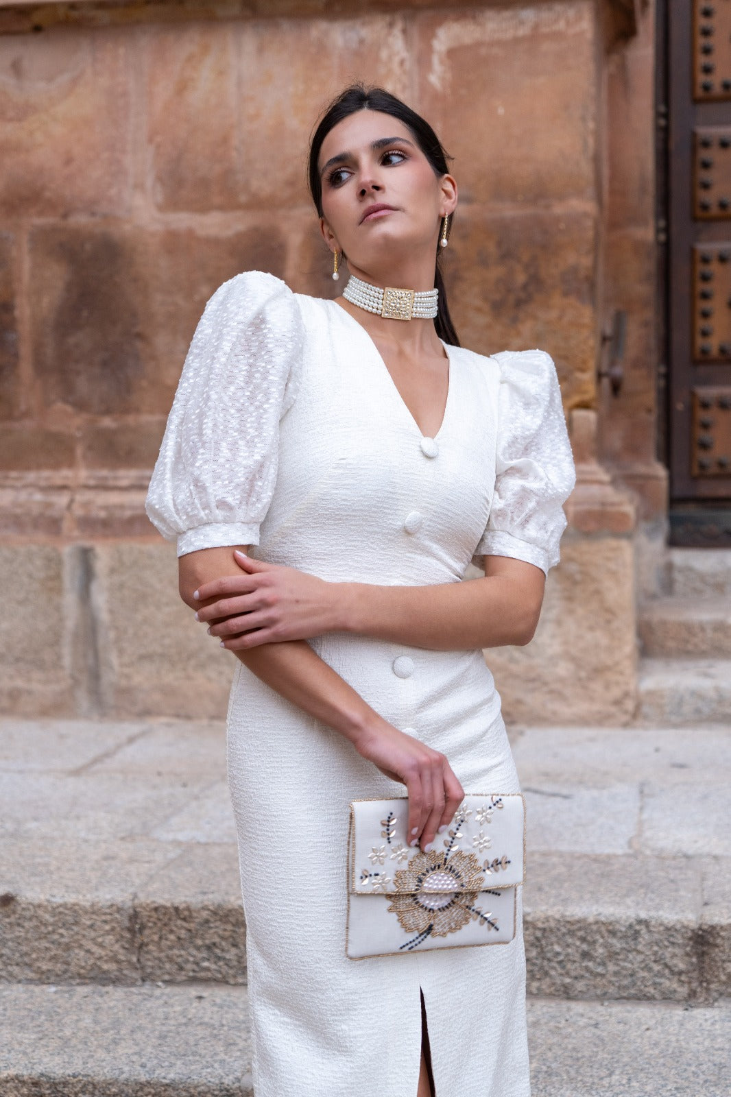 Chocker compuesto por cinco hileras de perlas perfectamente alineadas que abrazan el cuello con elegancia, culminando en un espectacular broche cuadrado con relieves.
