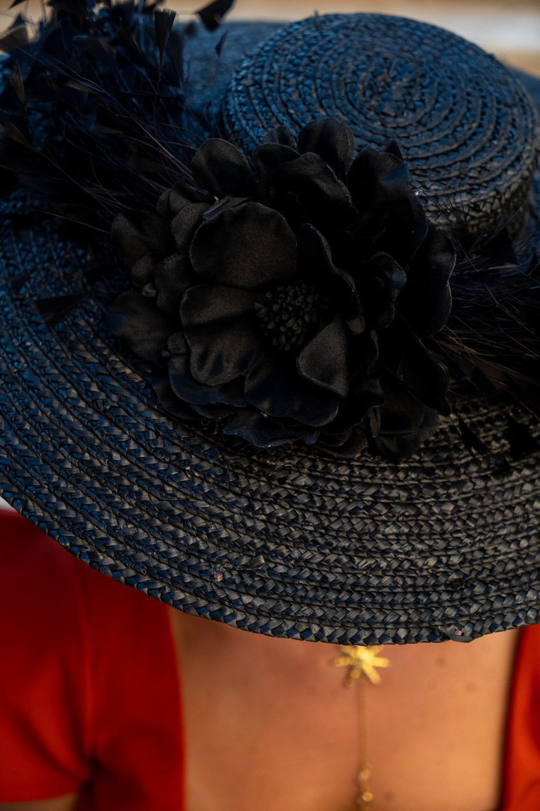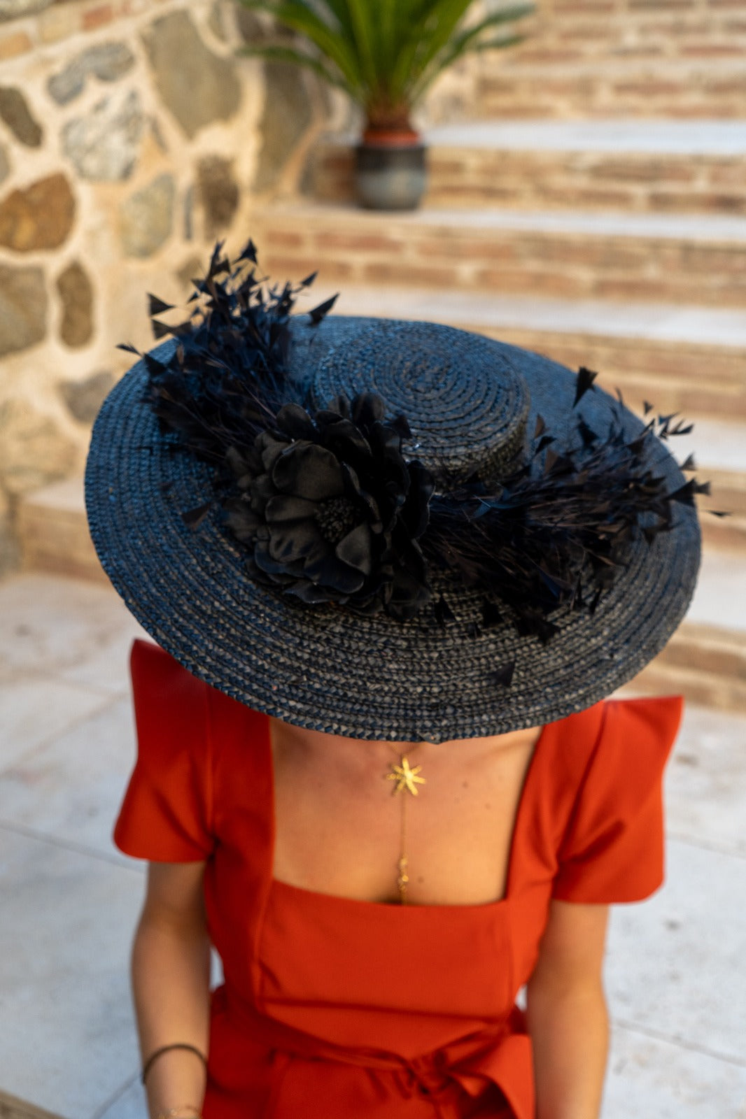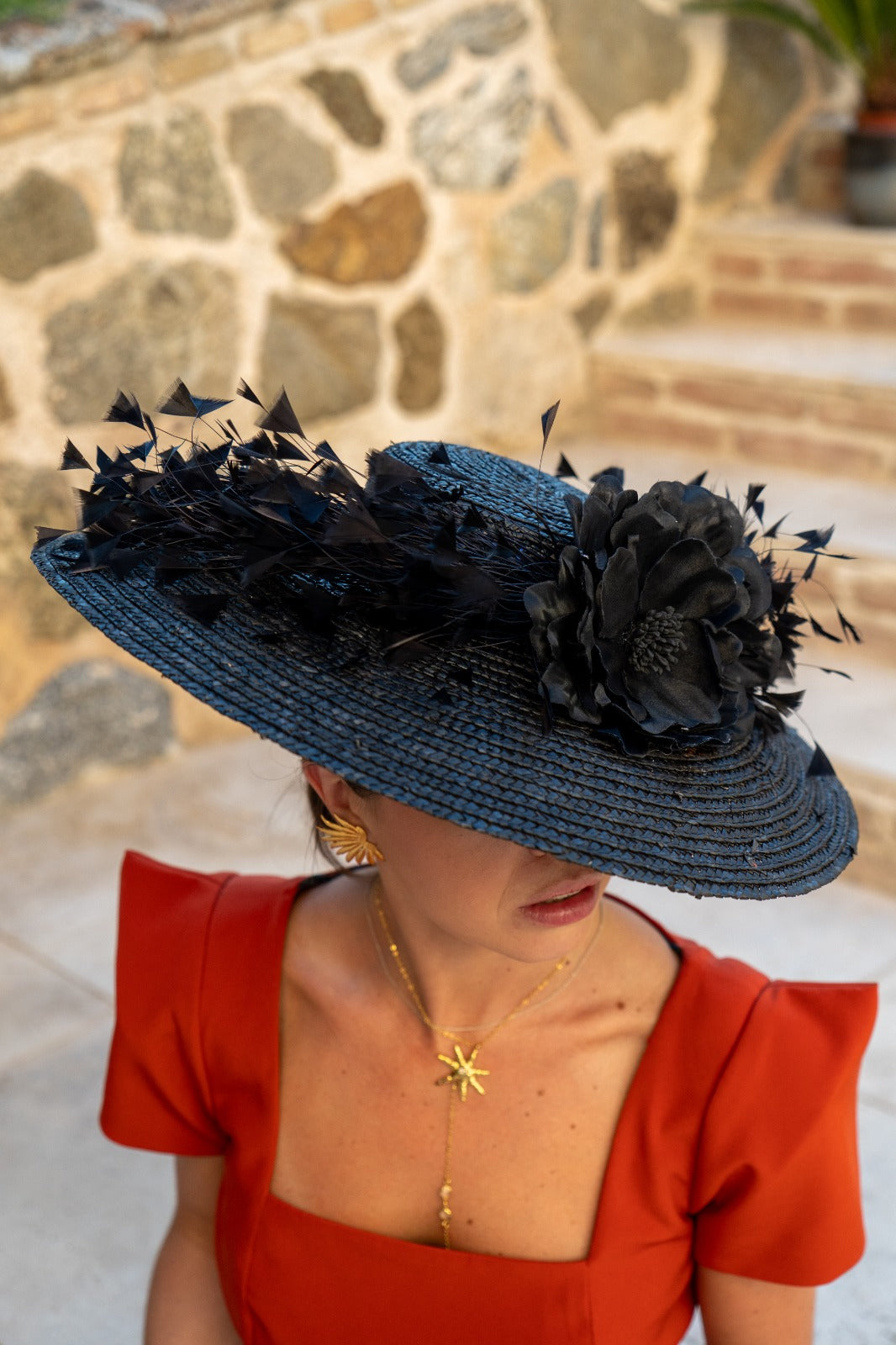 Pamela, detalles flores, en color paja, teñido de forma artesanal en negro. Diadema para sujeccion.