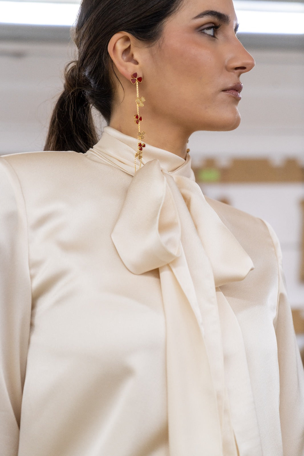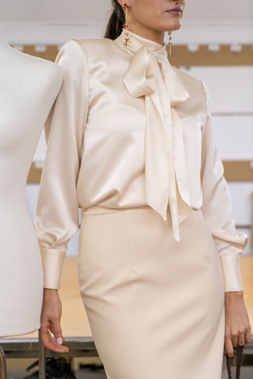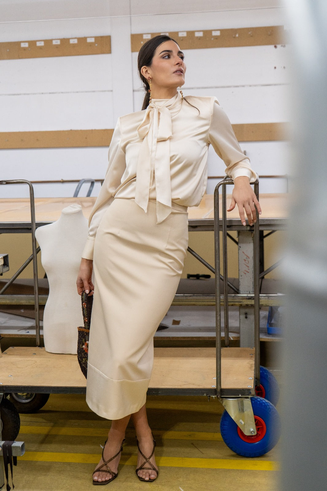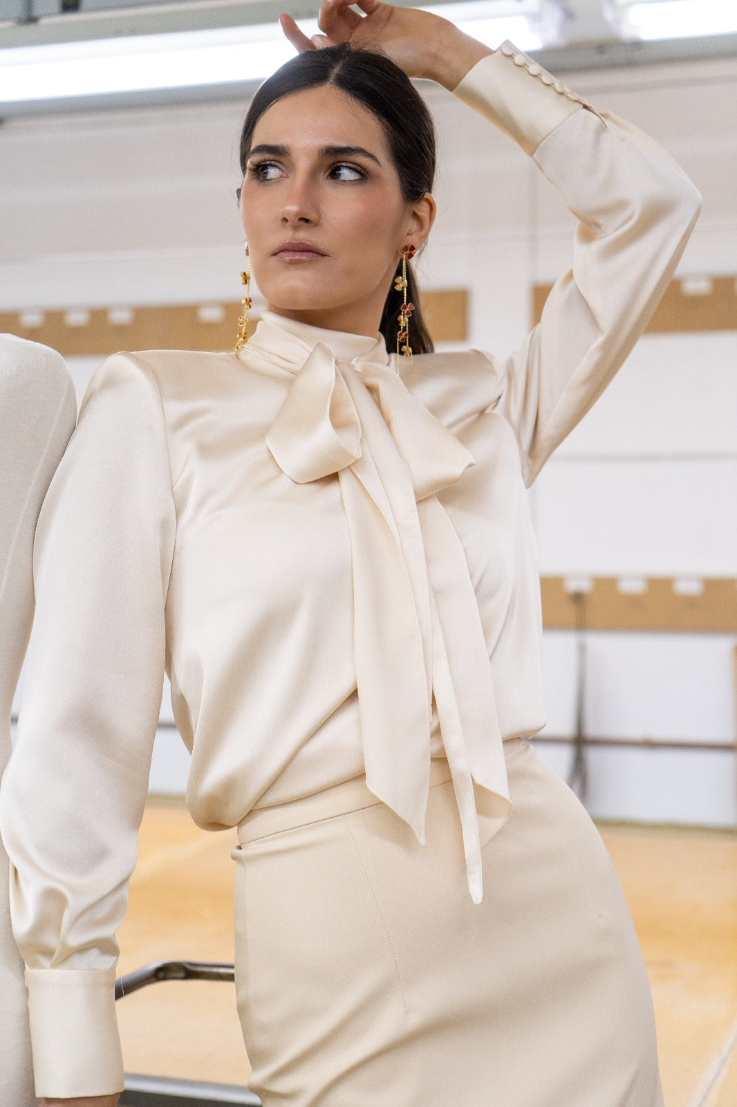 Conjunto compuesto por top satinado con cuello tirilla que cierra en la parte trasera, hombros marcados y falda recta con cinturilla y pieza en brillo en el bajo. En color marfil.