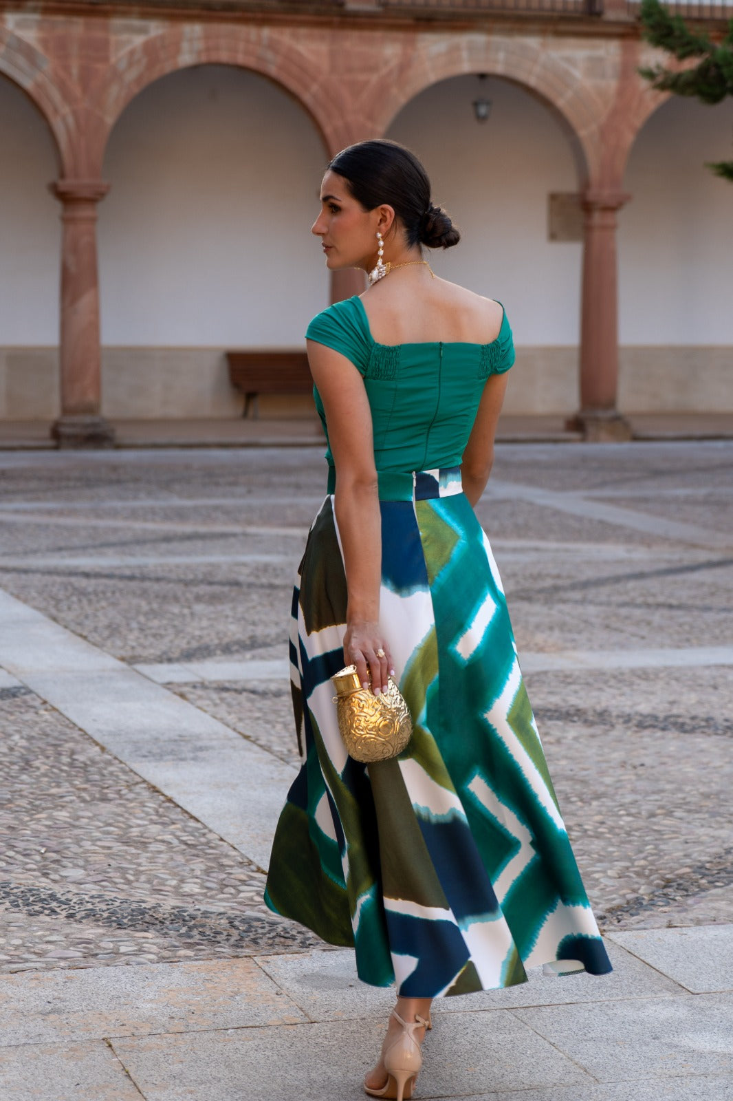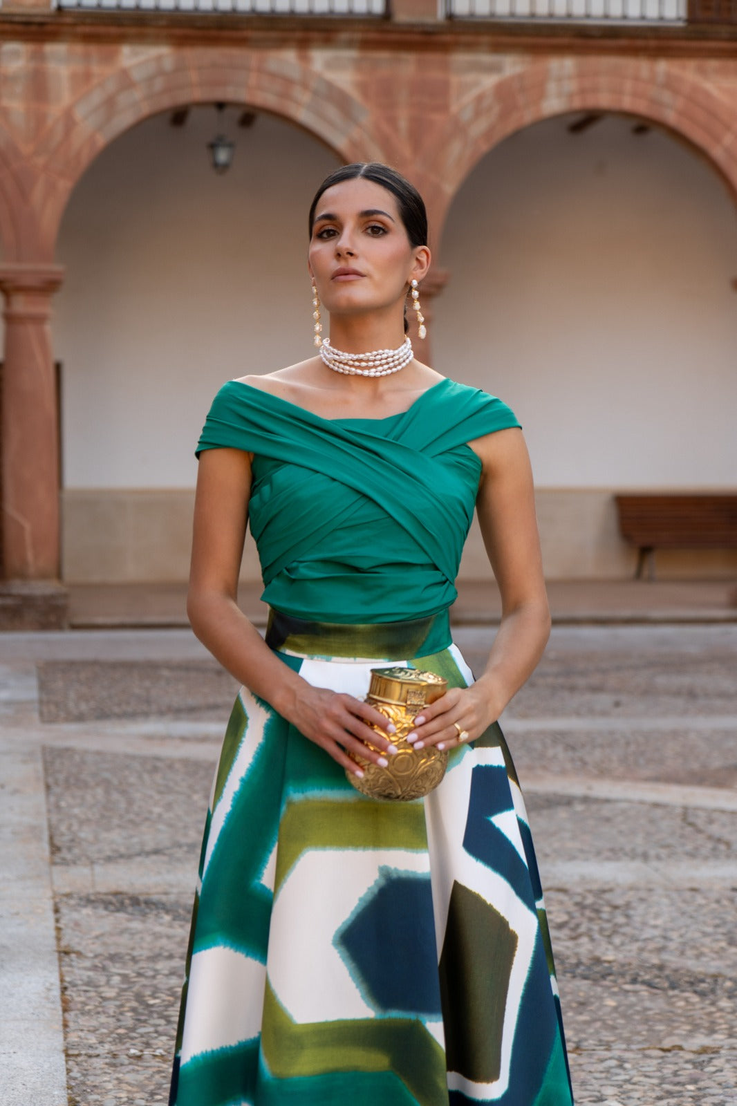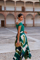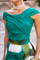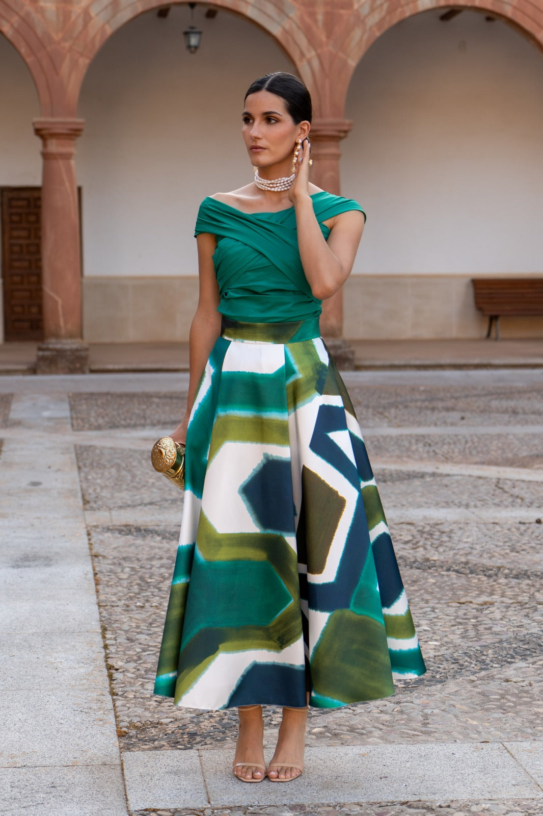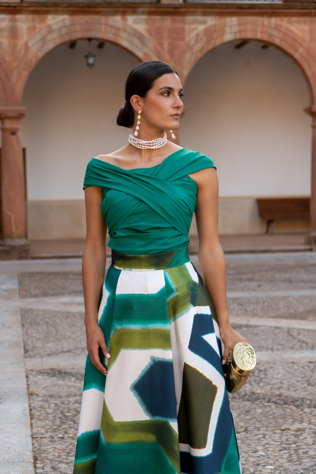 Conjunto formado por top escote bardot cruzado y falda alta con vuelo. En color verde y falta estampada.