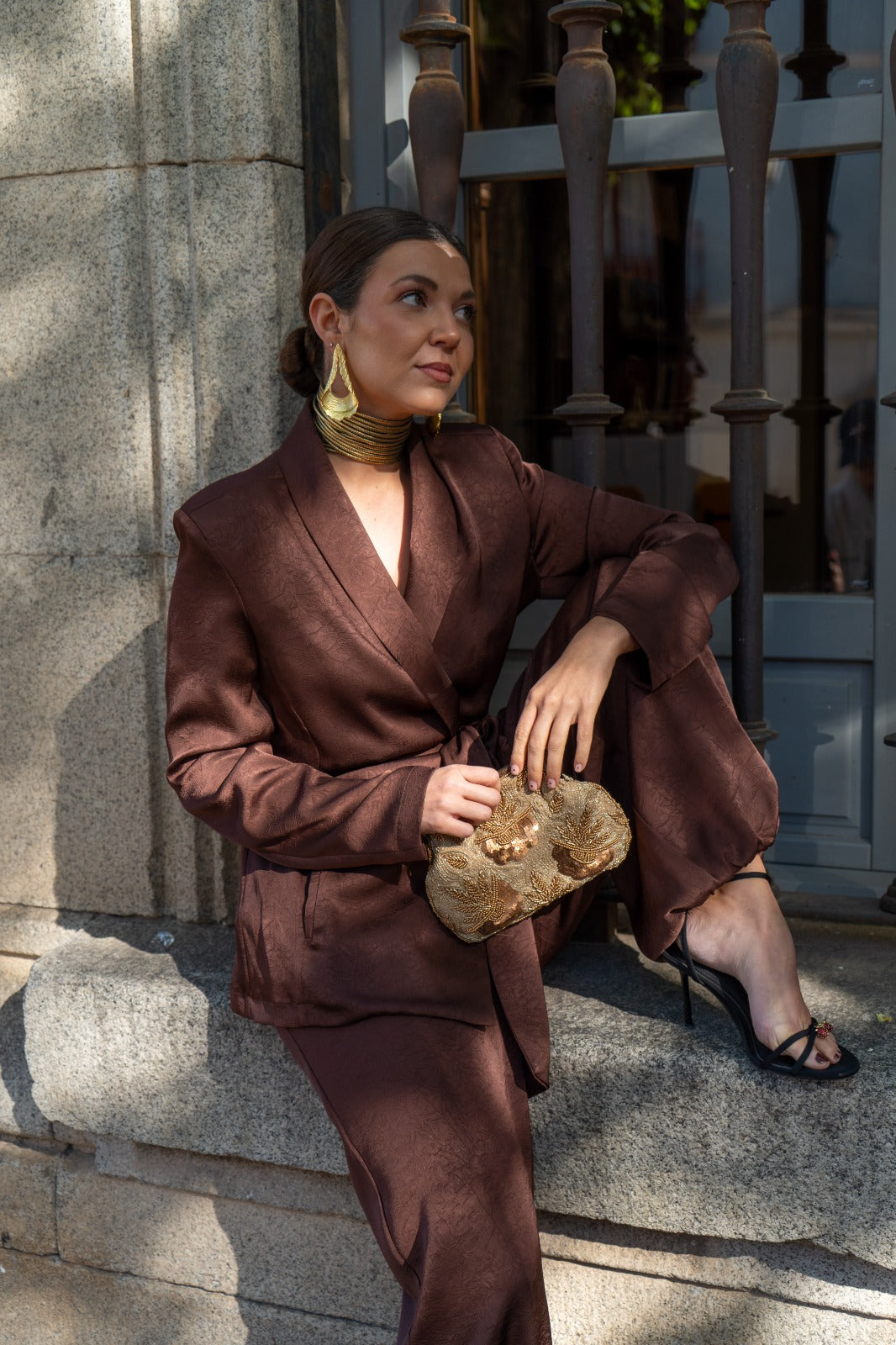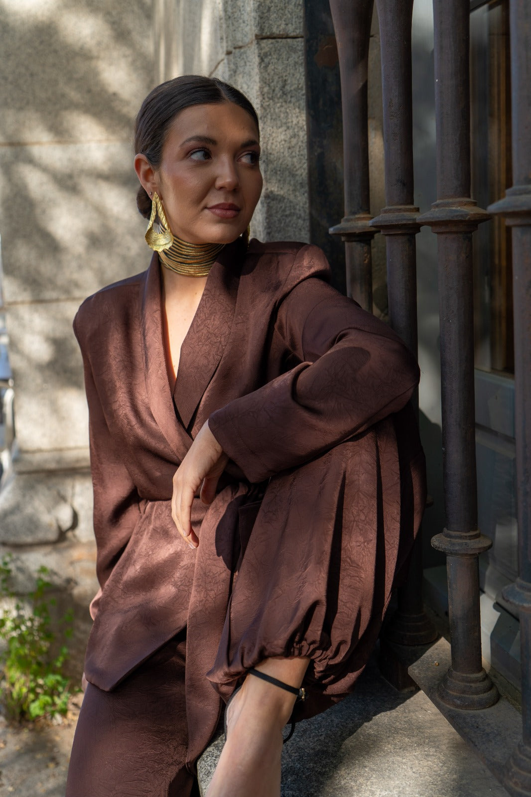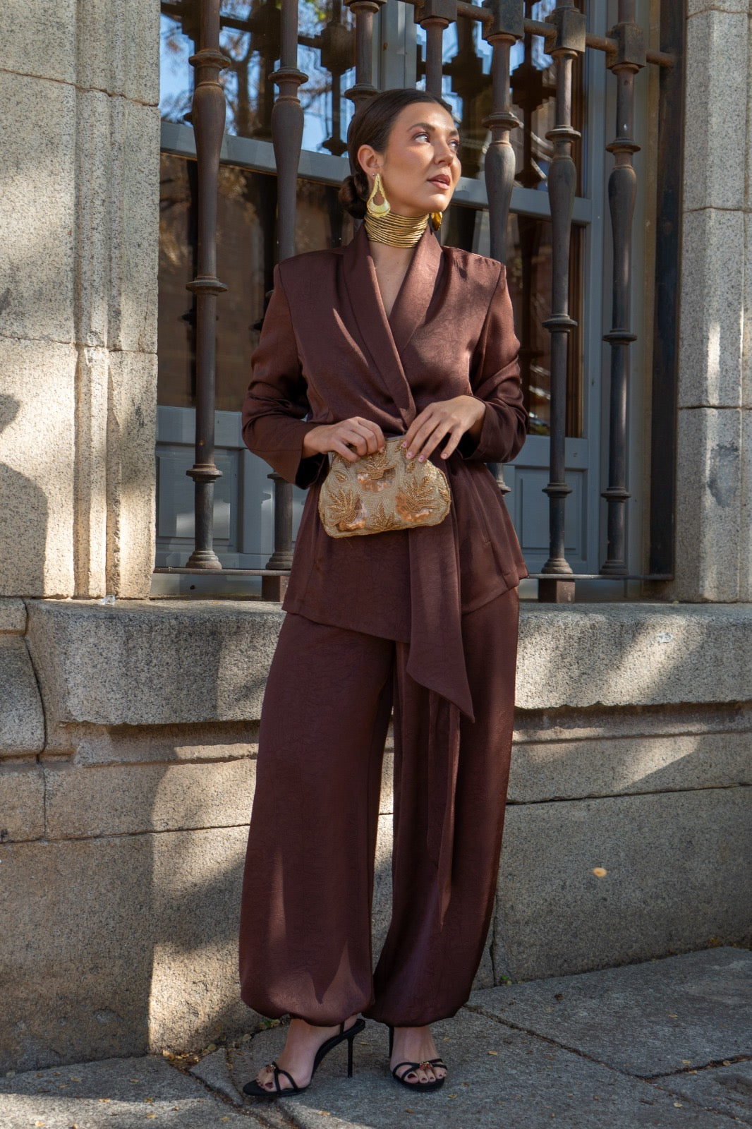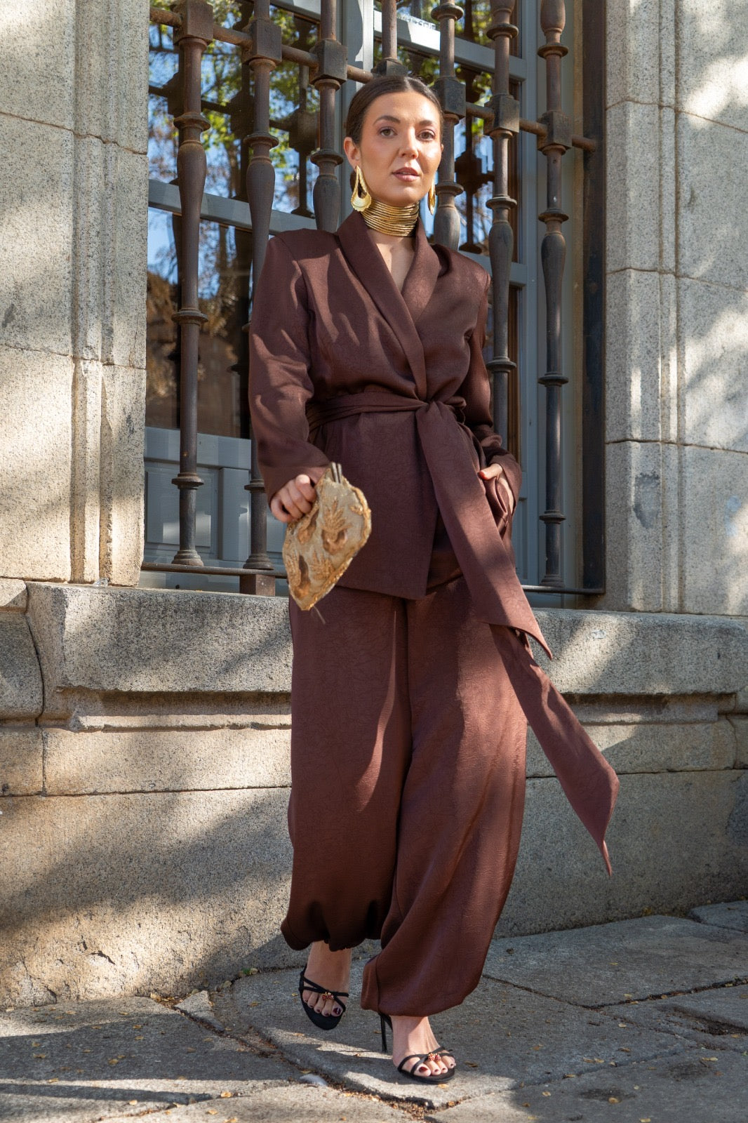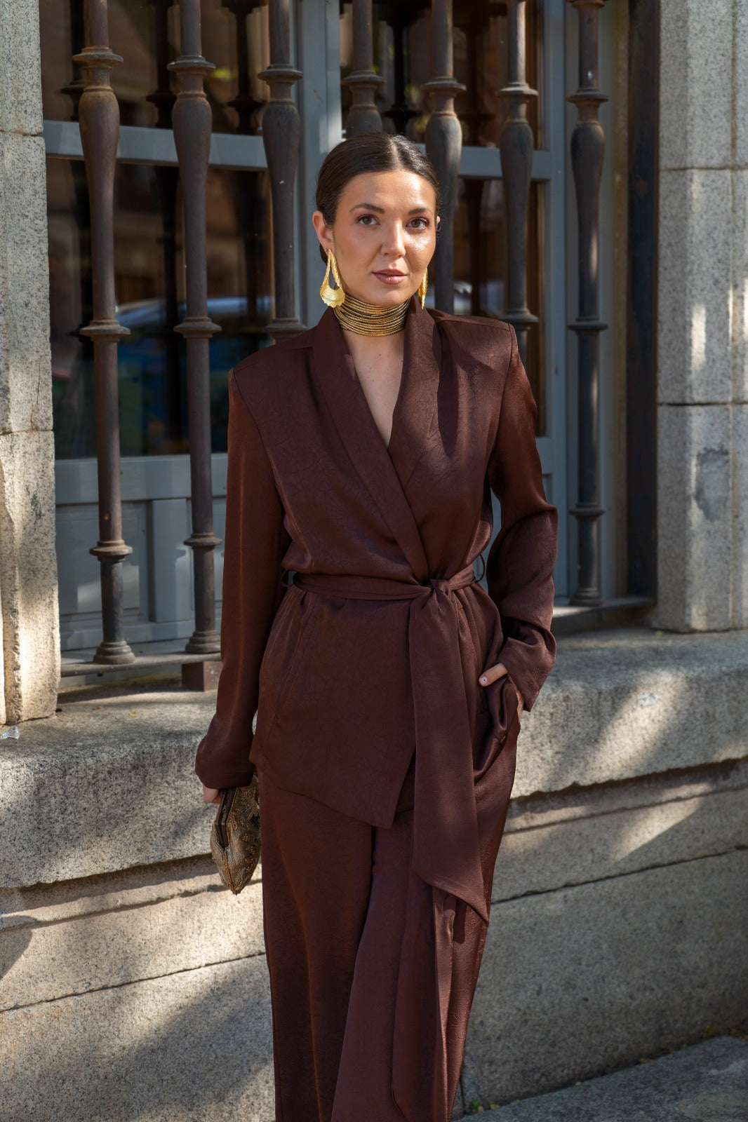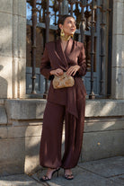 Conjunto compuesto por chaqueta cruzada, cerrada con lazo y pantalón bombacho, goma en la parte trasera de la cintura, bolsillos laterales. En color marrón.