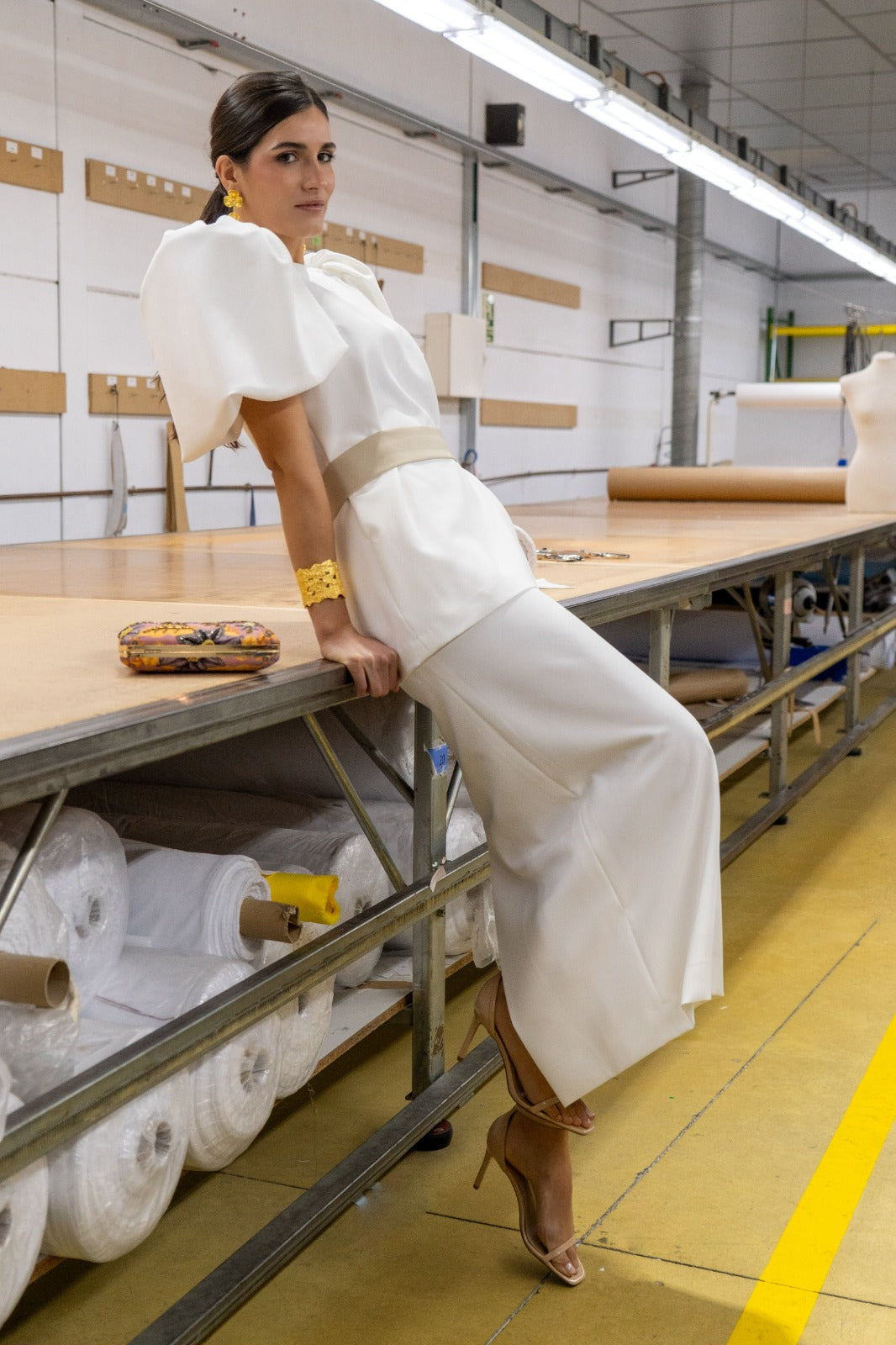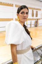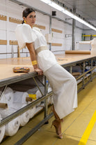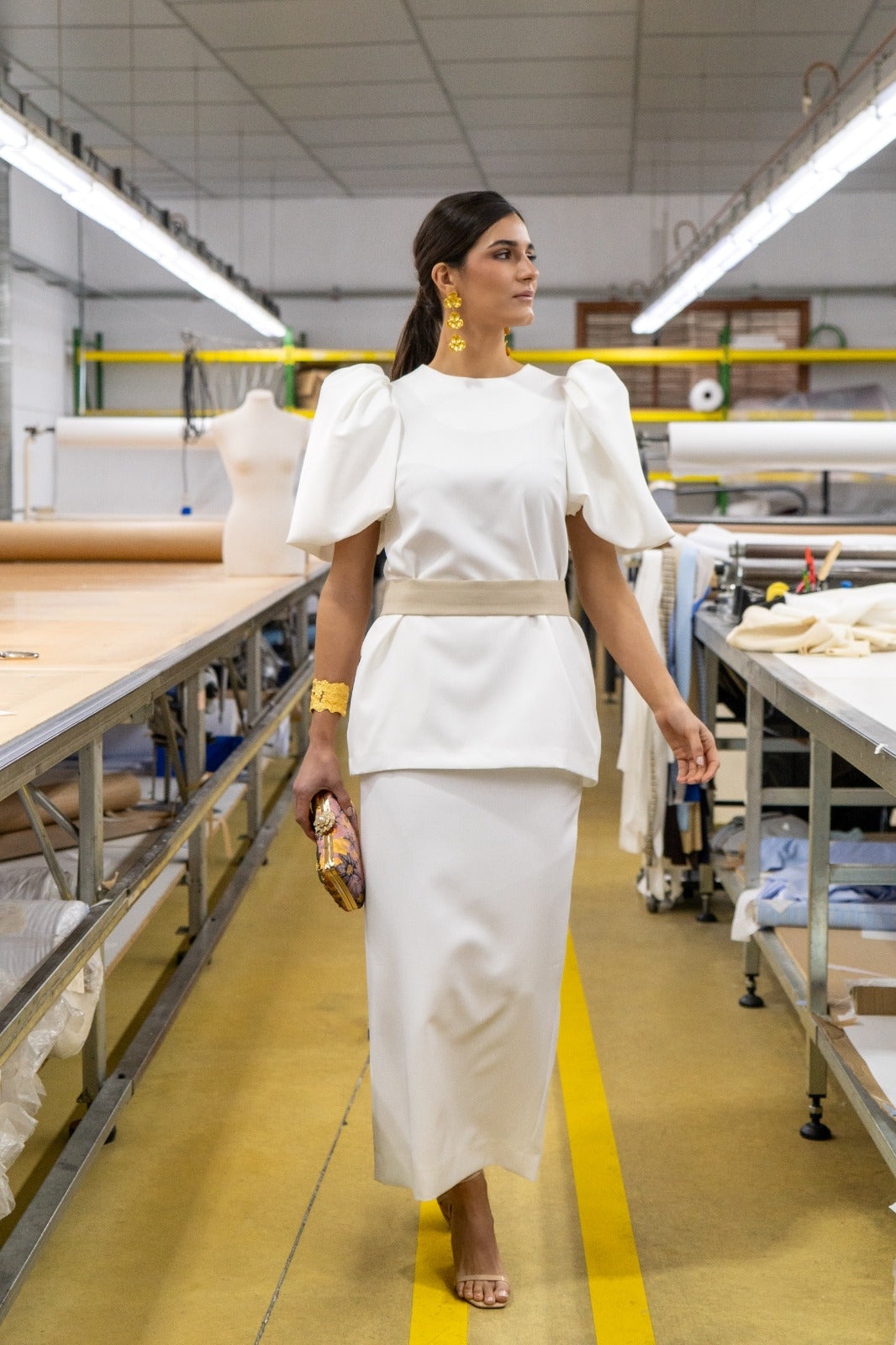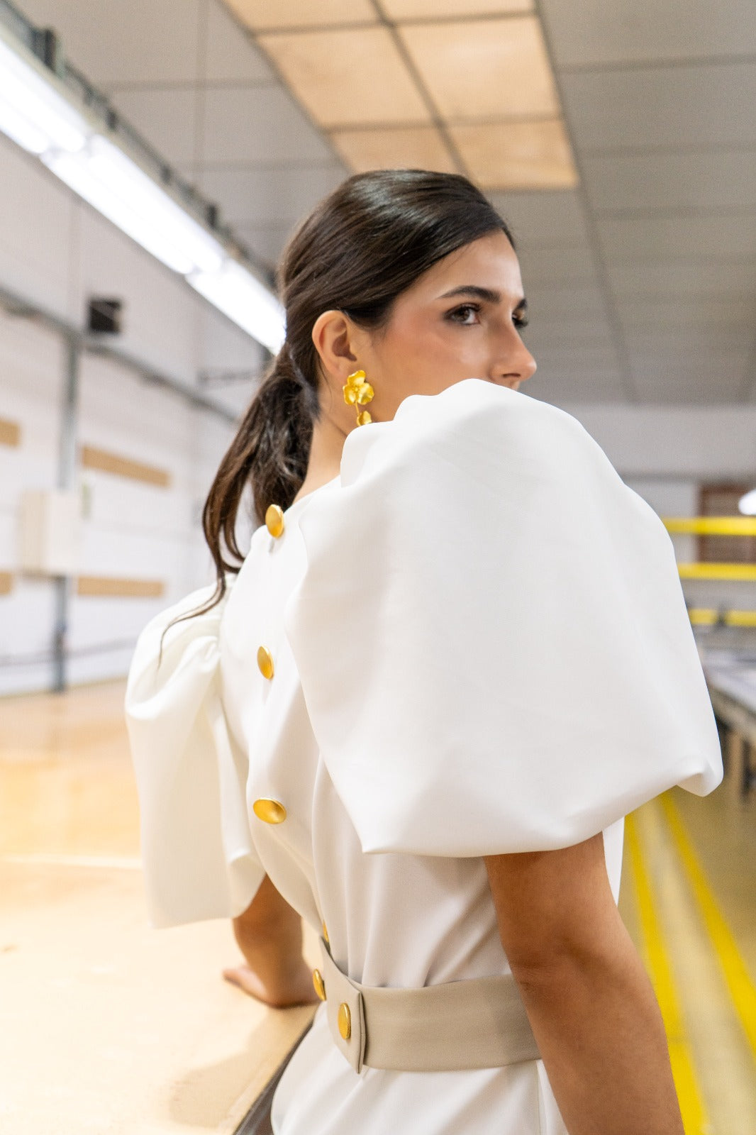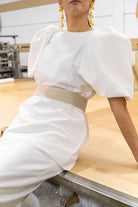 Conjunto compuesto por casaca larga, escote redondo, maxi manga abullonada, detalle botones dorados en la espalada y falta alta, abertura trasera, cinturón en color topo. En crep blanco.