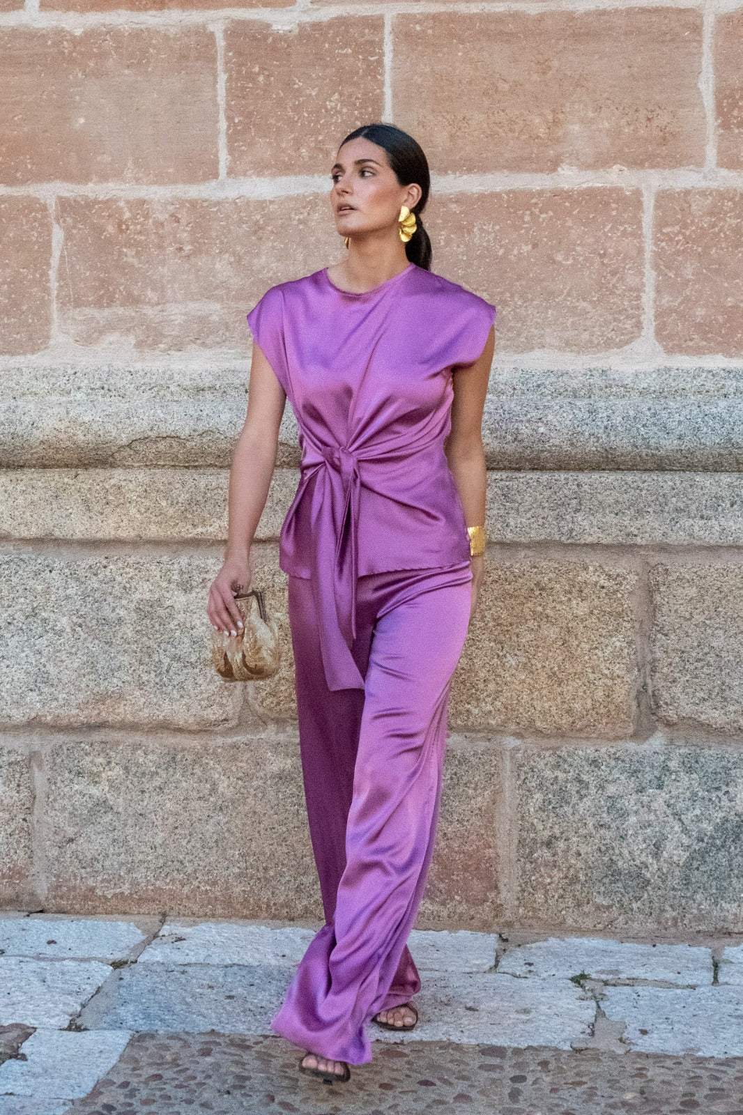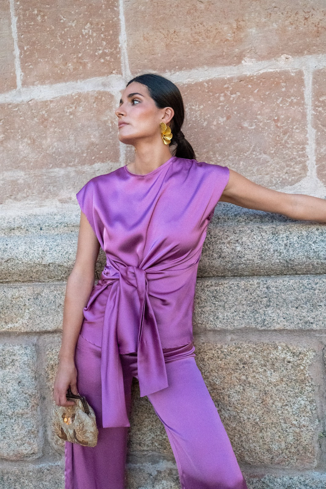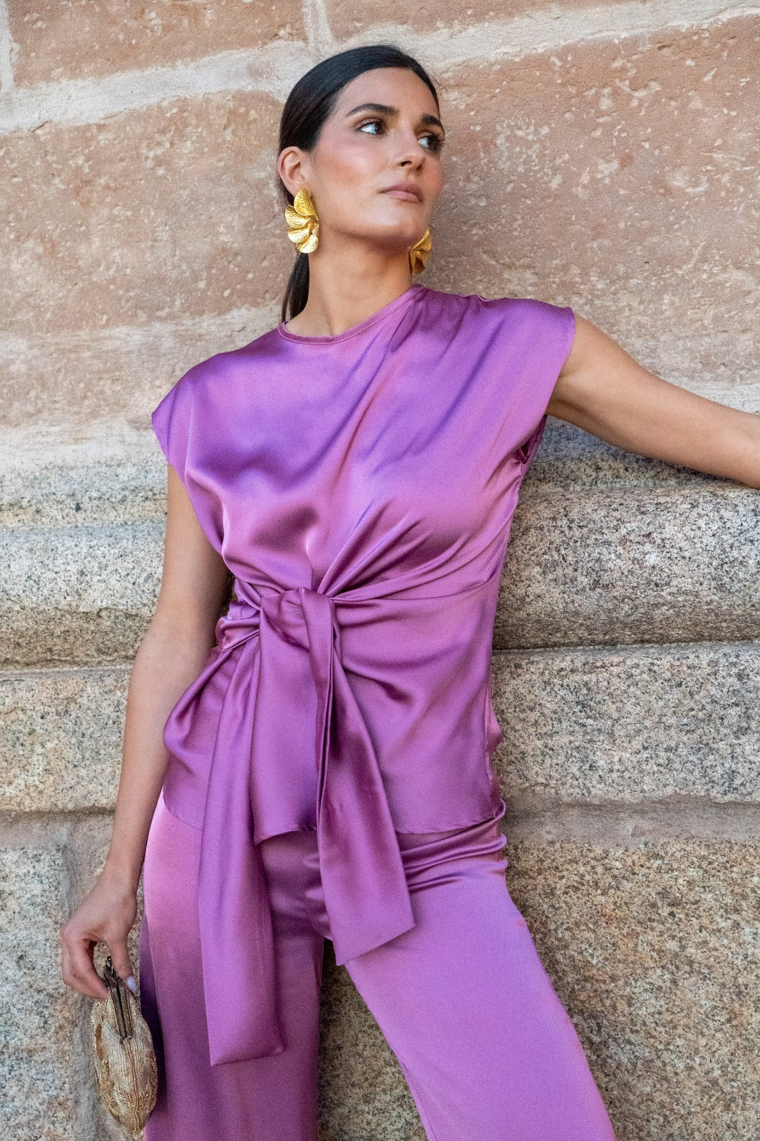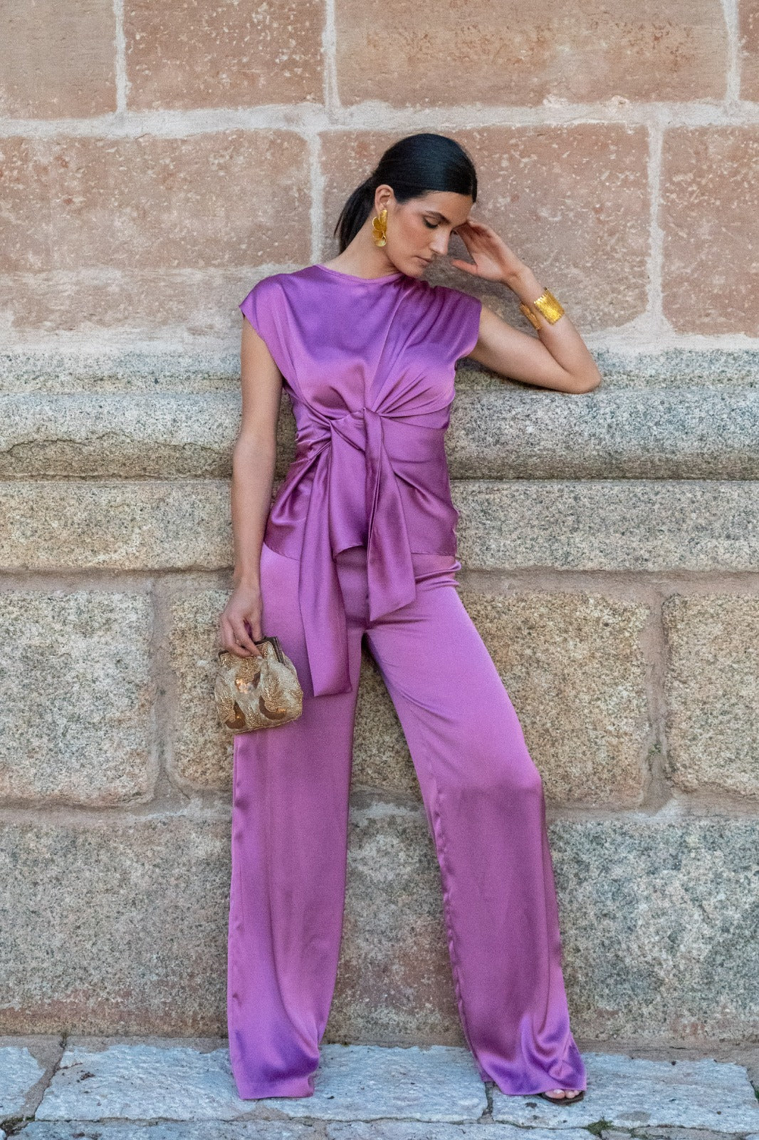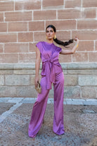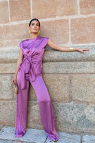 Conjunto compuesto por blusa escote redondo, sin mangas, lazo anudado aun lado y pantalón con cremallera y engomado, recto. En color malva.