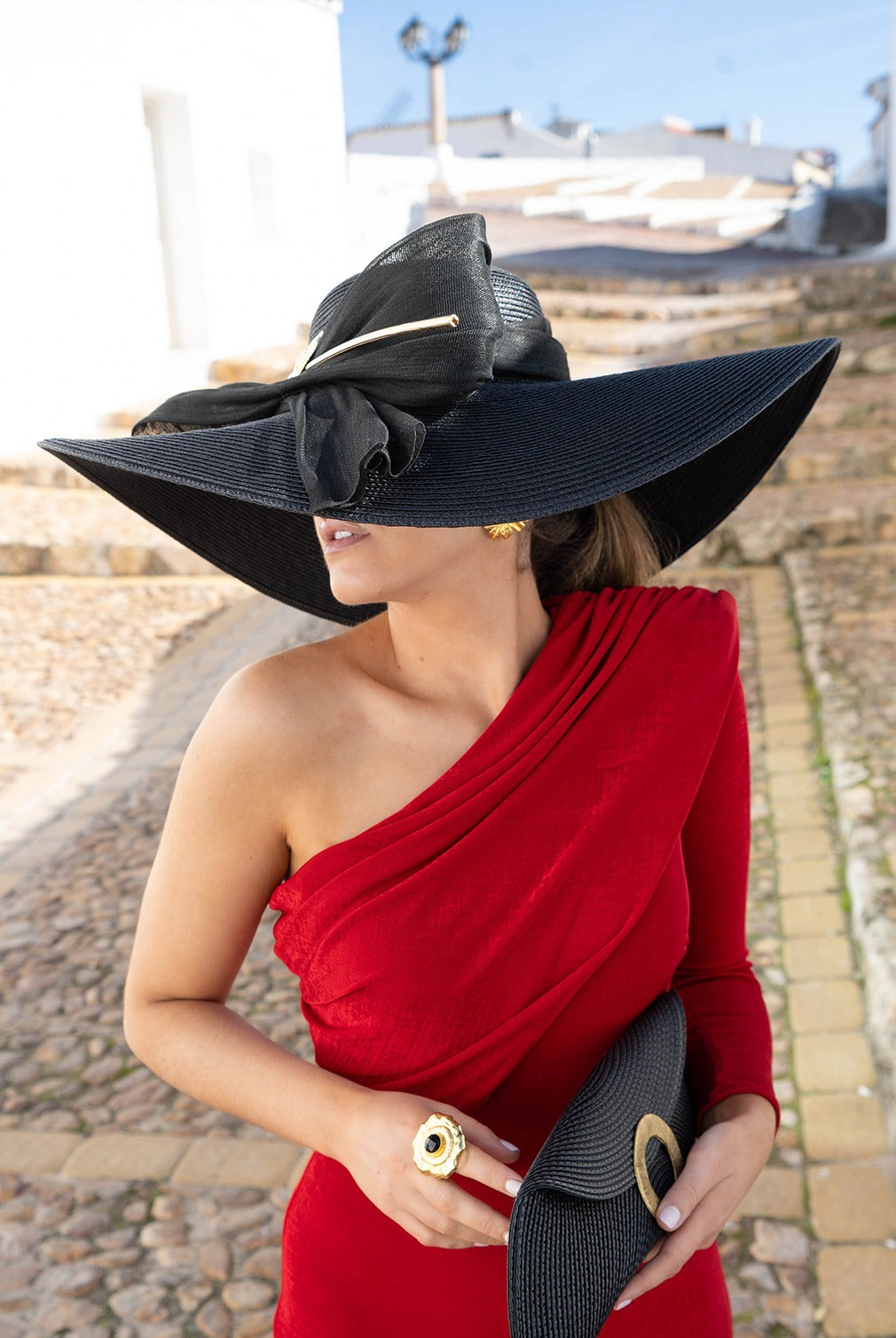 Pamela negra de polipropileno, elaborada a mano con una lazada de sinamay de seda rematada con un raqui y hojas doradas de latón, con diadema para sujetar.
