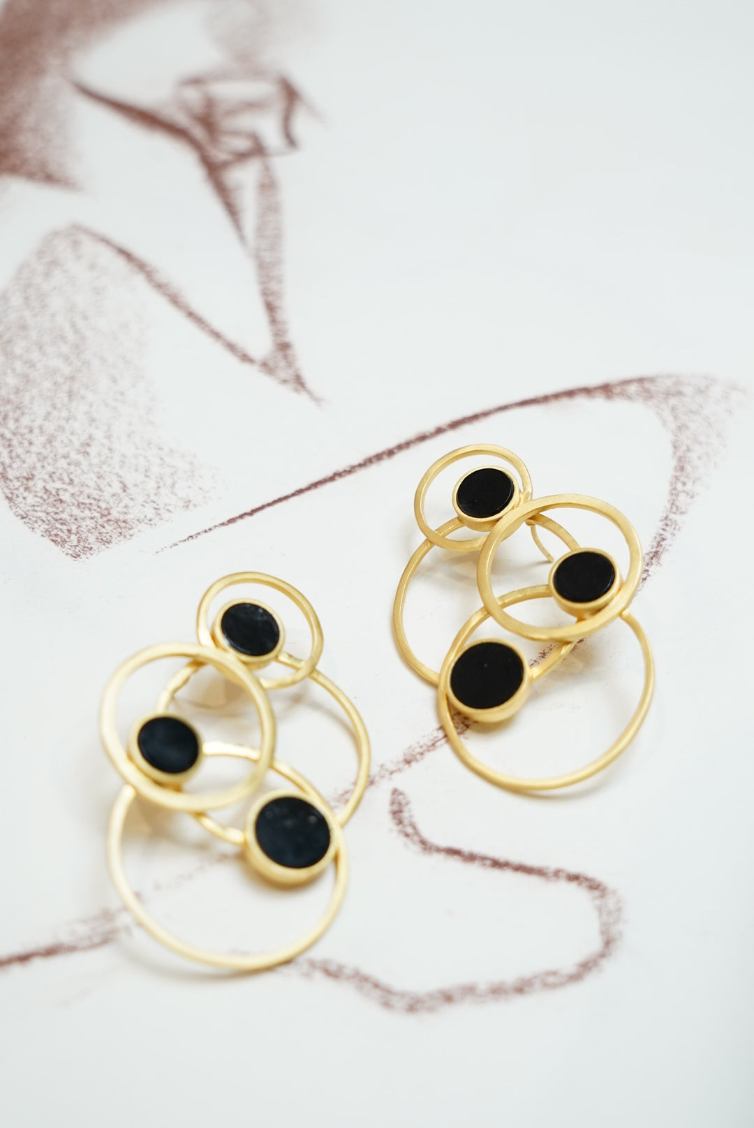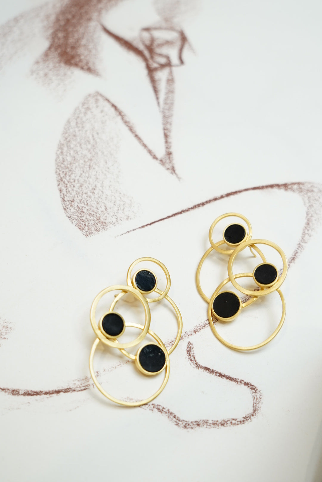 Pendientes dorados formados por varias circunferencias, detalle circurferencia en color negro. Pendientes realizados artesanalmente.
