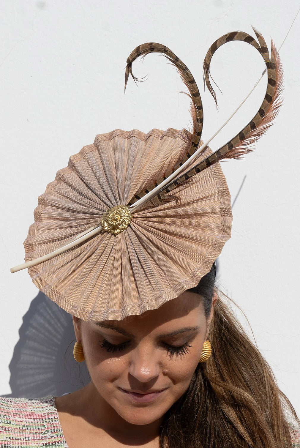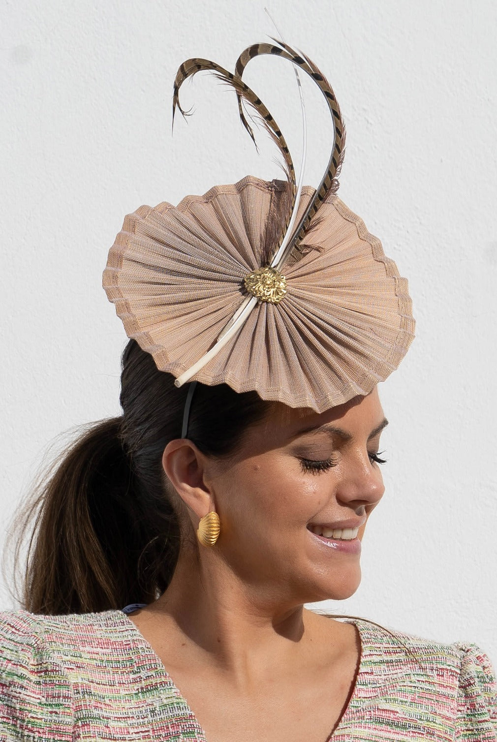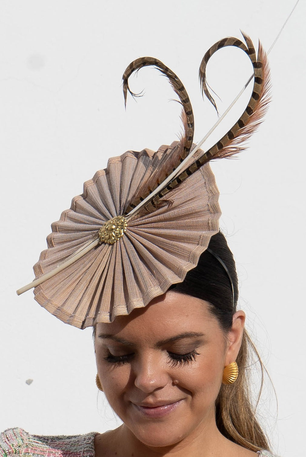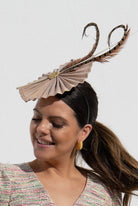 Tocado con base redonda nude, detalle plumas marron, con diadema para sujetar.