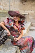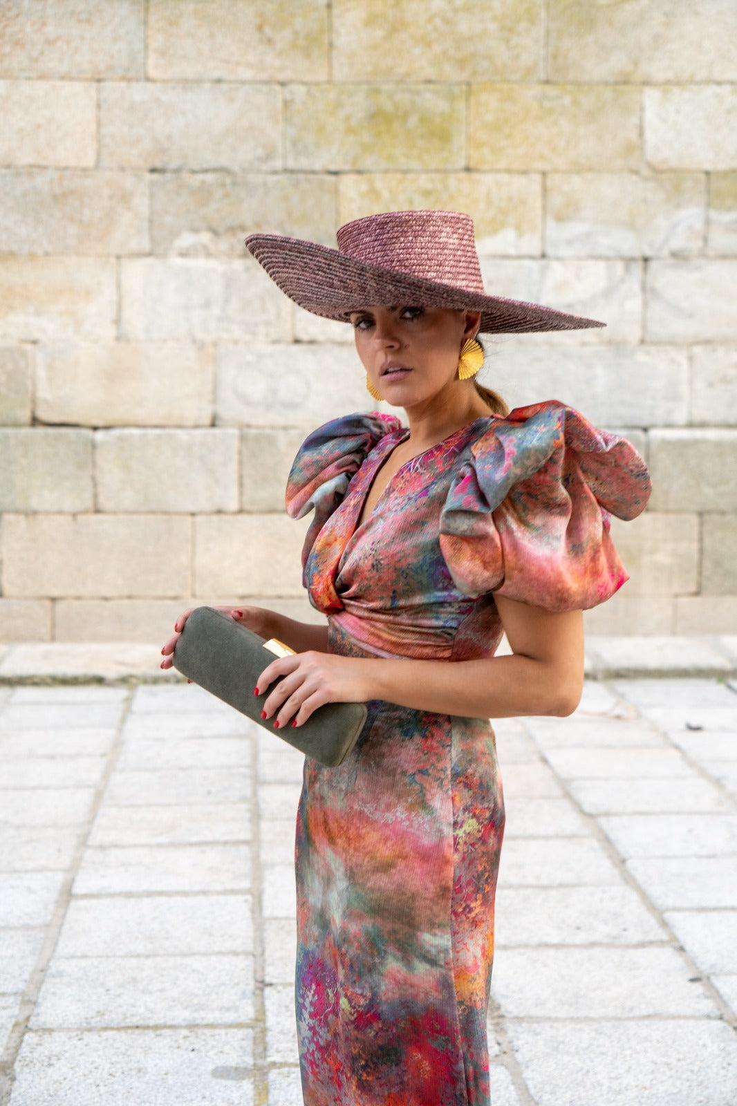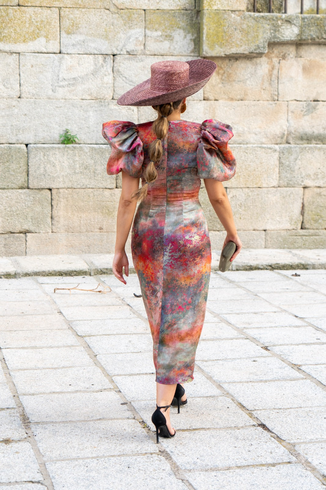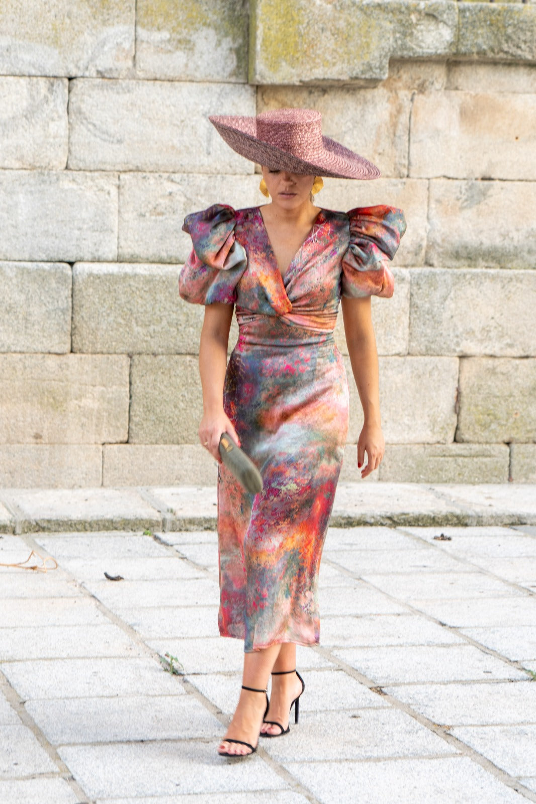 Vestido escote a pico terminado en nudo, cut out, manga corta abullonada. En colores estampados.
