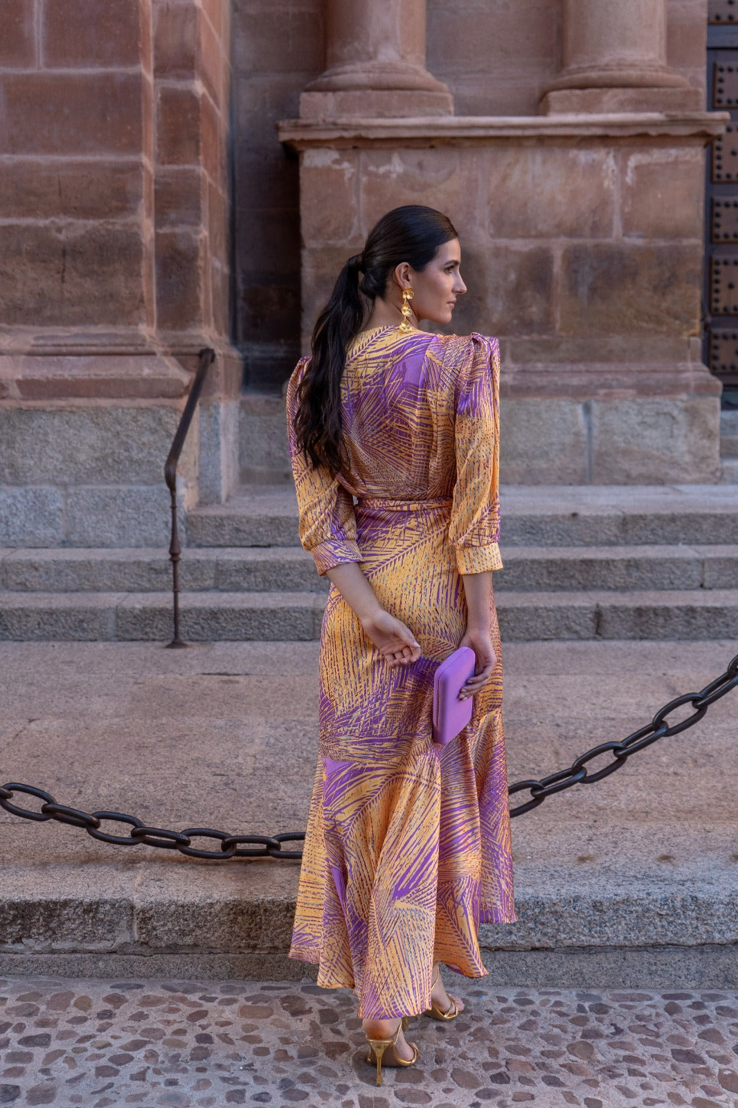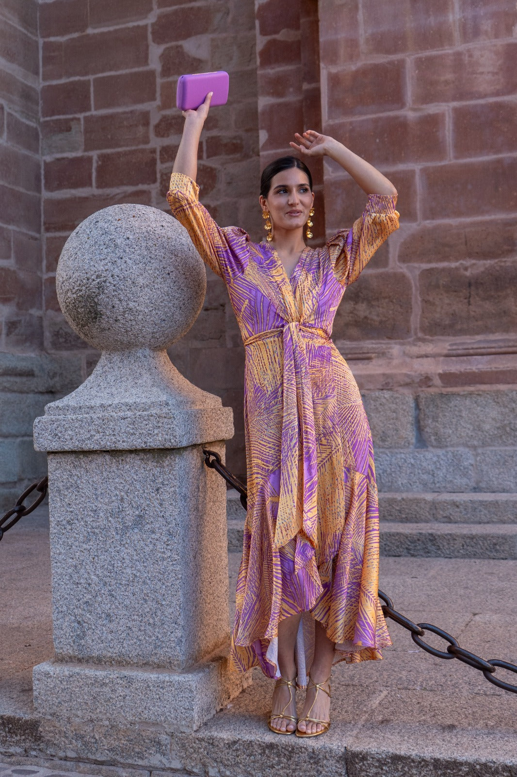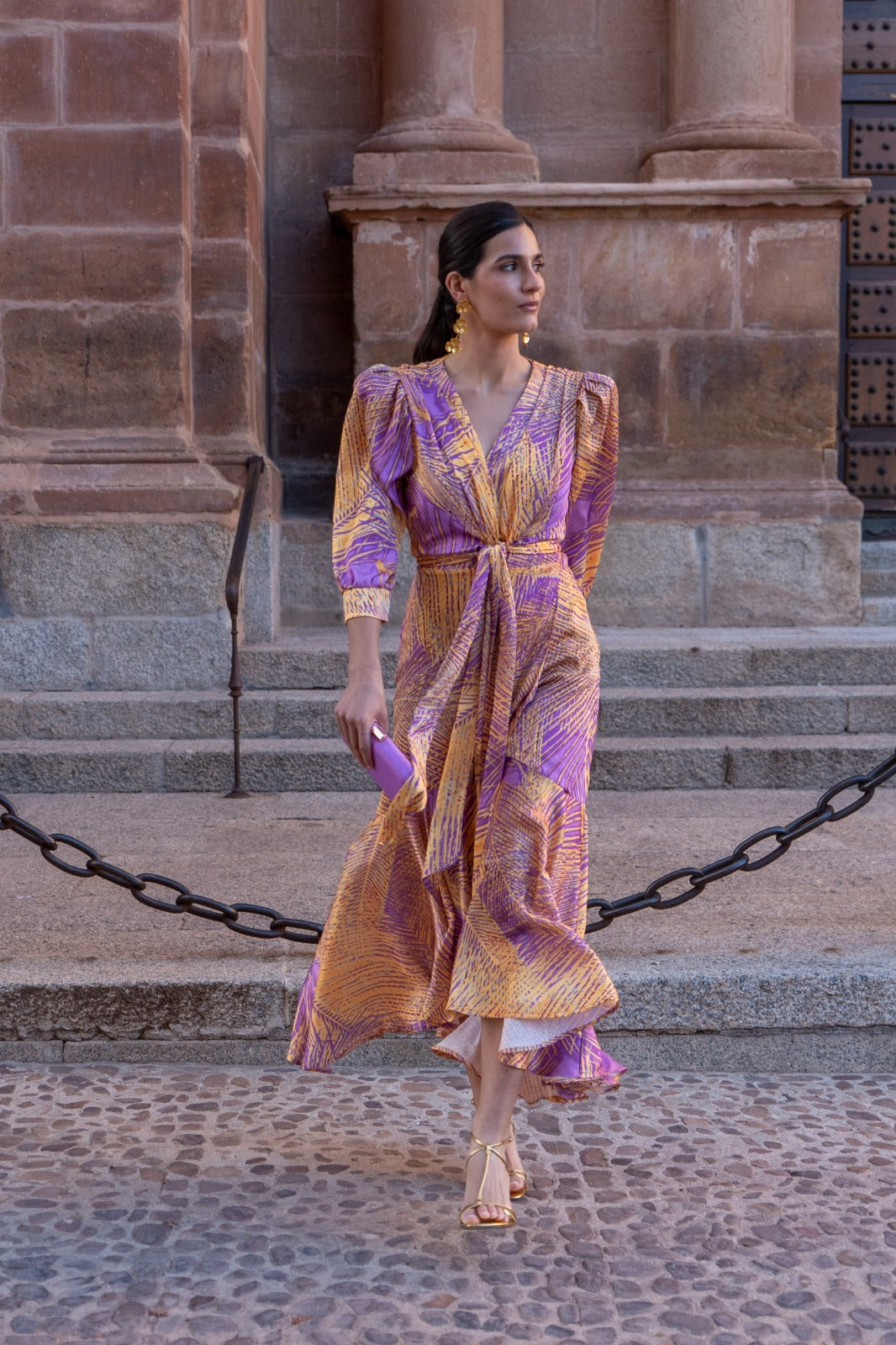 Vestido midi, fluido, cruzado con nudo, media manga y puño, forma delantera, mas largo de detrás. En colores estampados.
