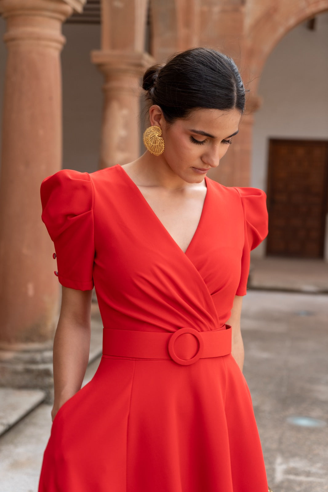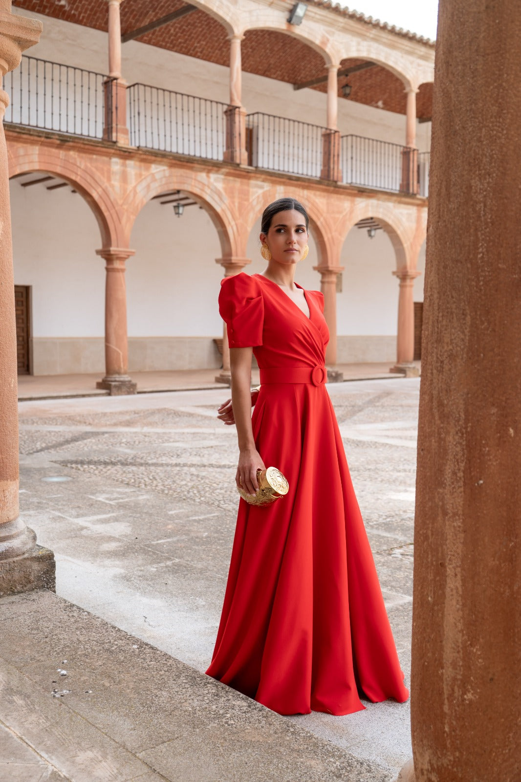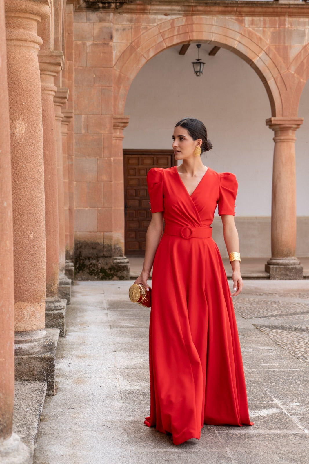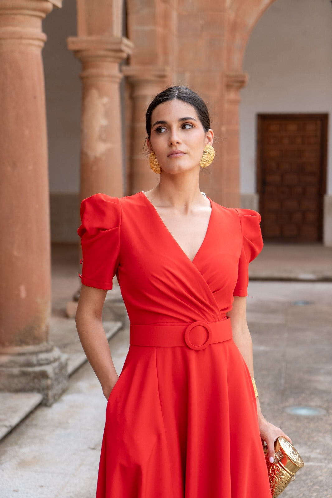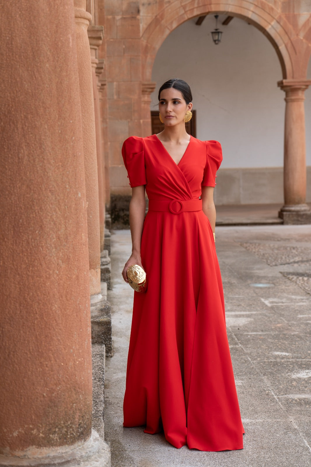 Vestido largo, escote cruzado, manga corta abullonada, bolsillos, corte en cintura con cinturón, abertura delantera, vuelo abajo. En color rojo.