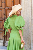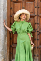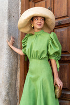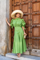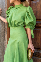 Vestido midi, manga corta abullonada con lazada ajustable, cuello alto y cuerpo fruncido, corte en la cintura y falda midi con vuelo. En color verde.