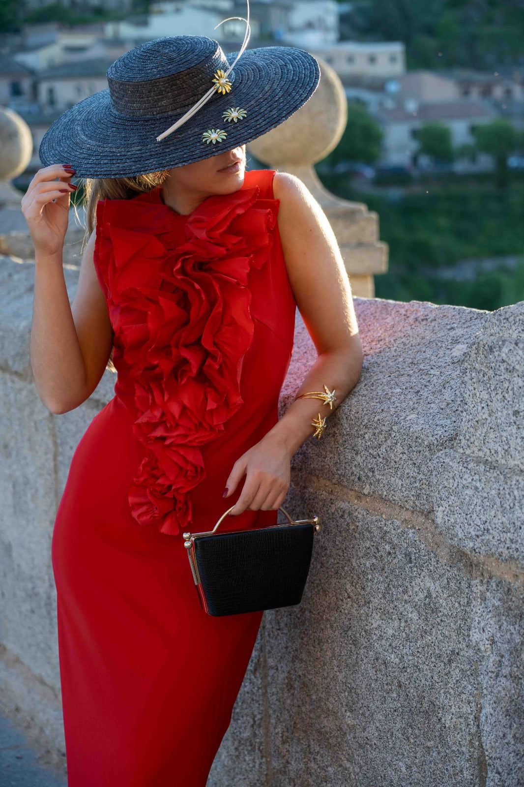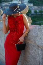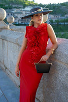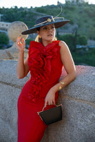 Vestido midi, escote redondo, con volante inspirado en claveles, sin mangas, abertura trasera. En color rojo.