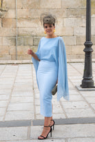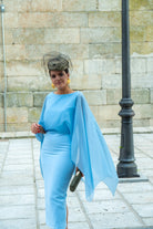 Vestido midi, escore redondo, escote trasero, sin mangas, gasa por encima, corte encintura, falda recta, abertura trasera. En color azul.