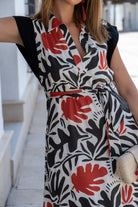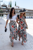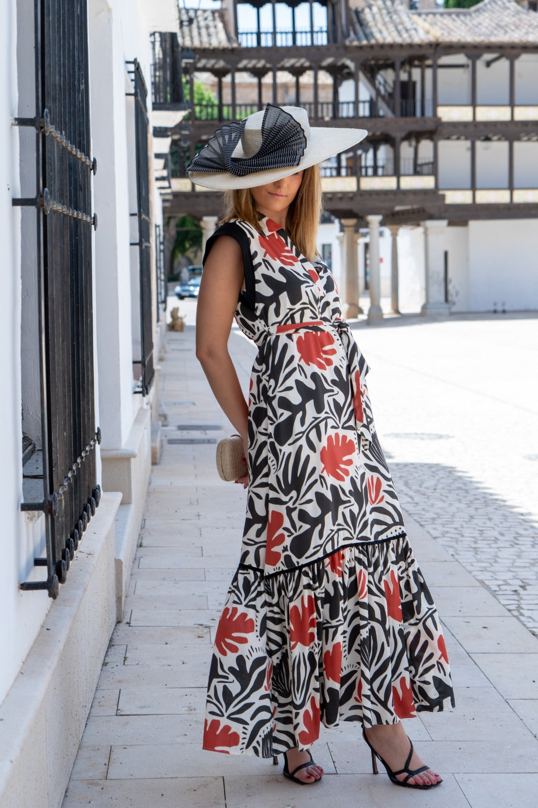 Vestido largo, escote a pico, sin mangas, cinturon incluido, volante abajo. En estamapdo multicolor.