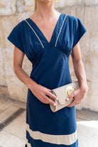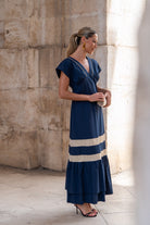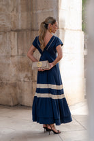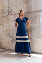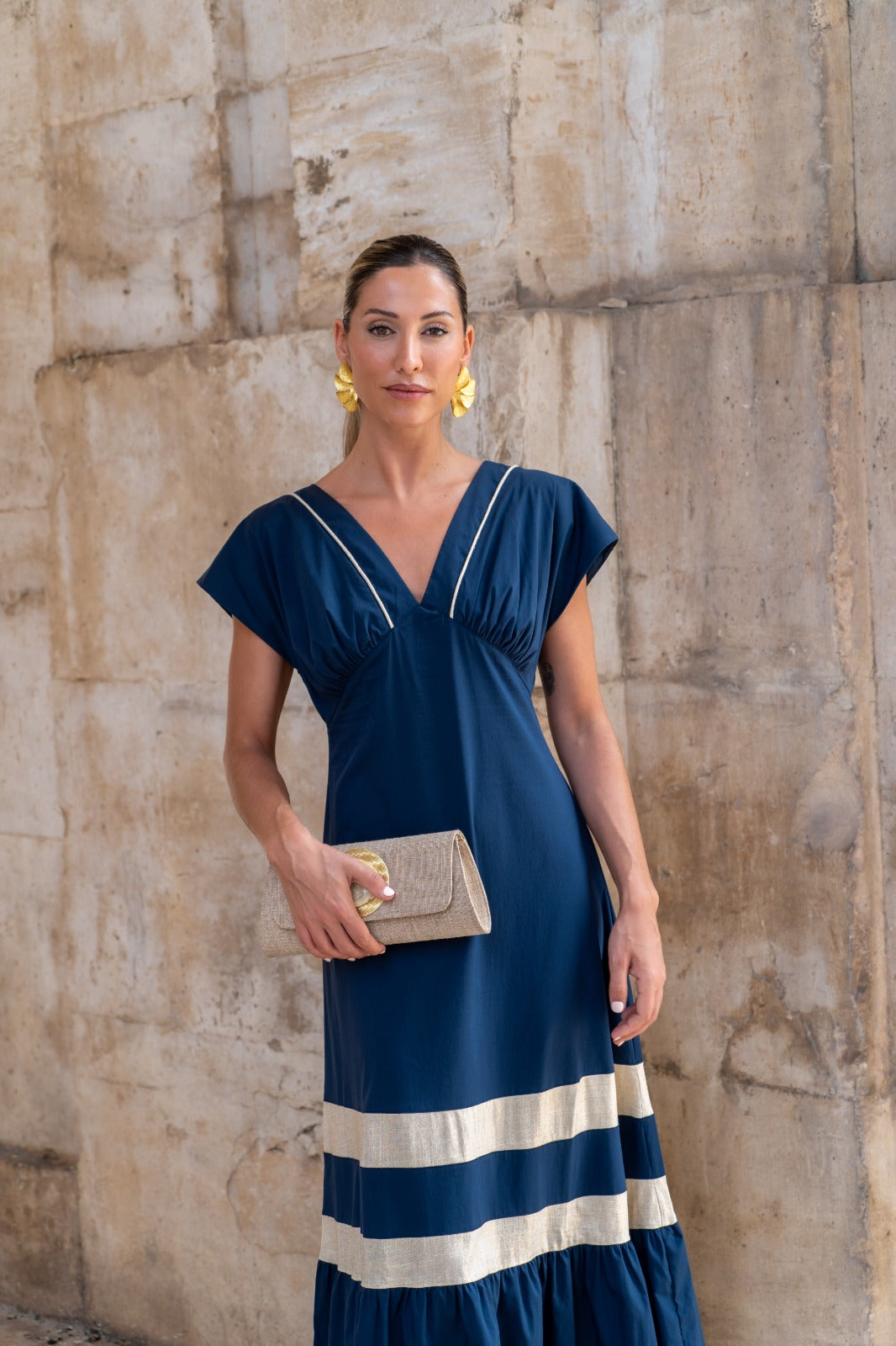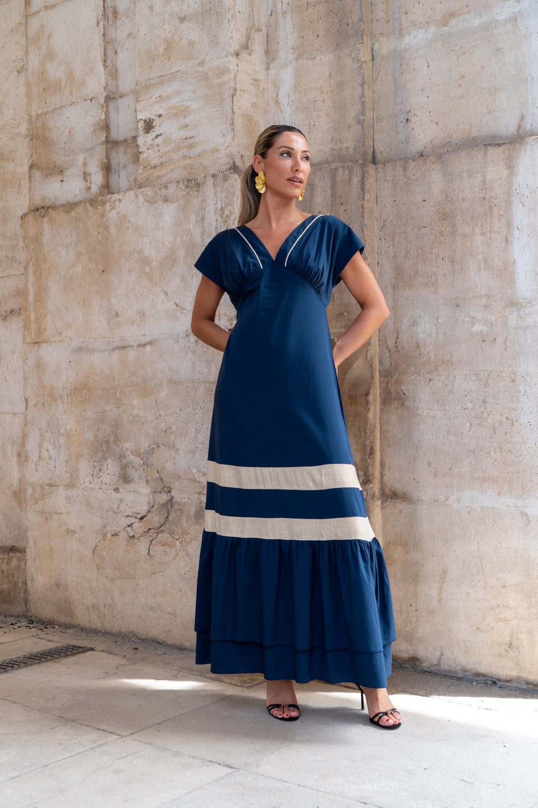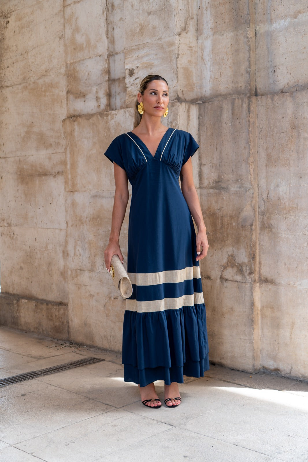 Vestido largo, escote delantero y trasero a pico, sin mangas, volante abajo. En color azul con detalles dorados.