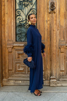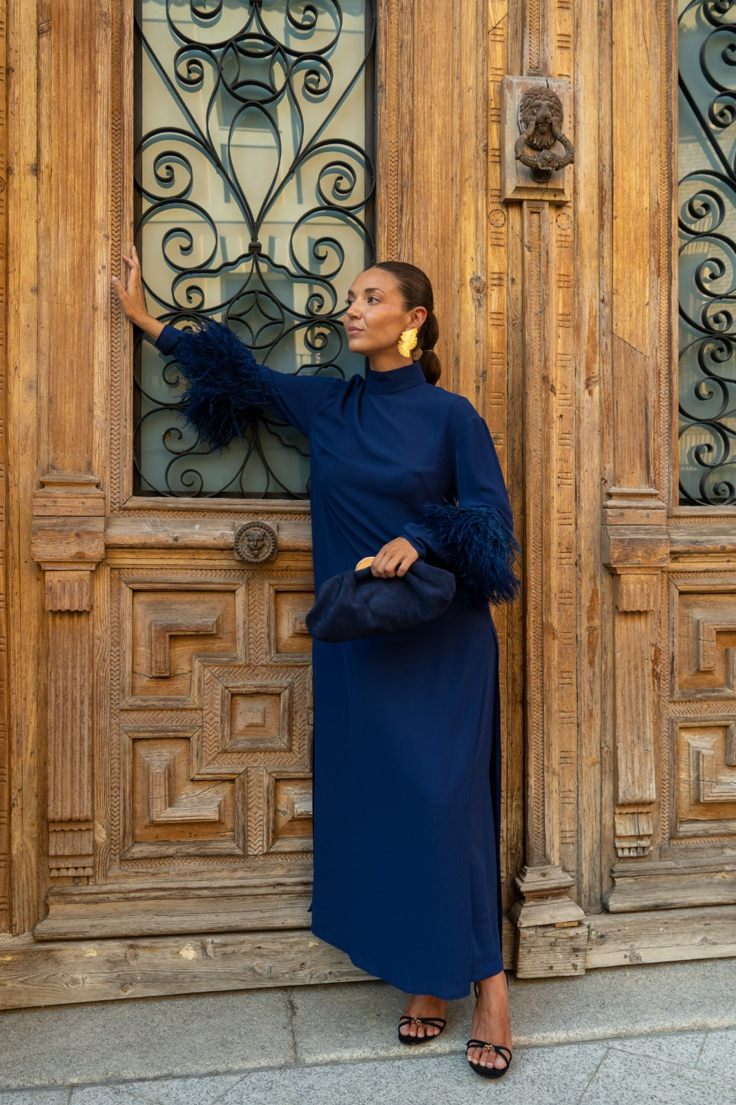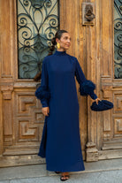 Vestido lencero de hombreras con kaftan encima, cuello tirilla, manga larga con detalle plumas ave a mitad del brazo, abertura lateral. En color frambuesa.