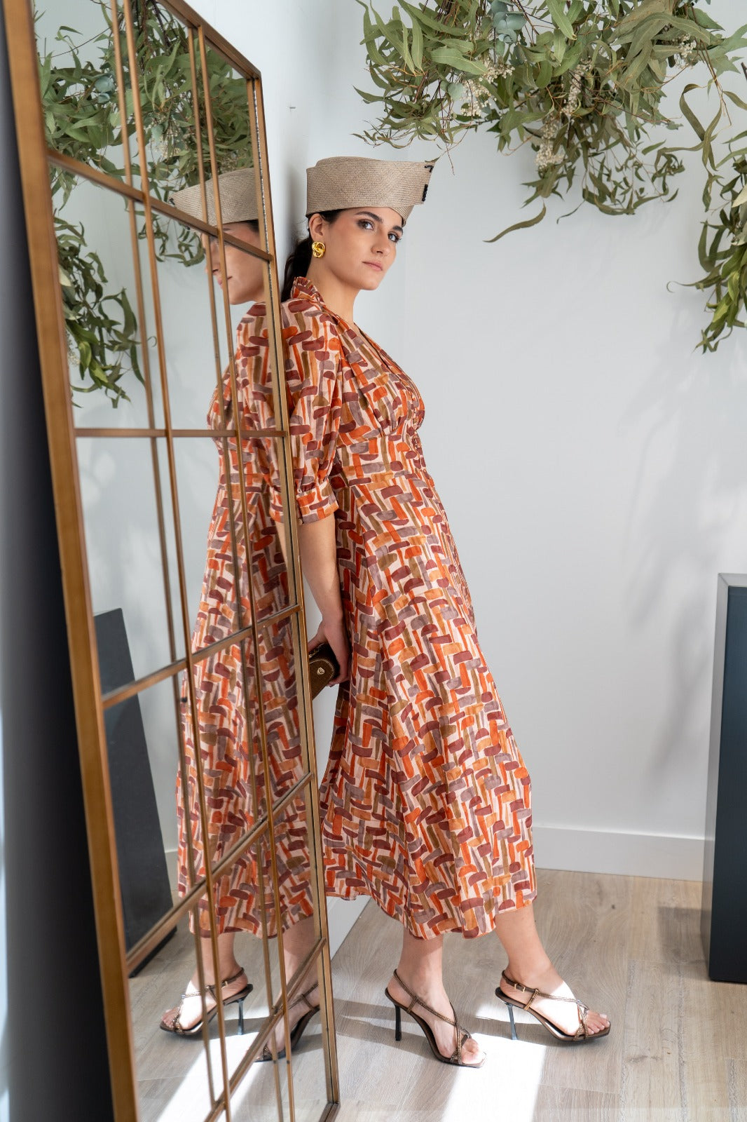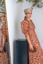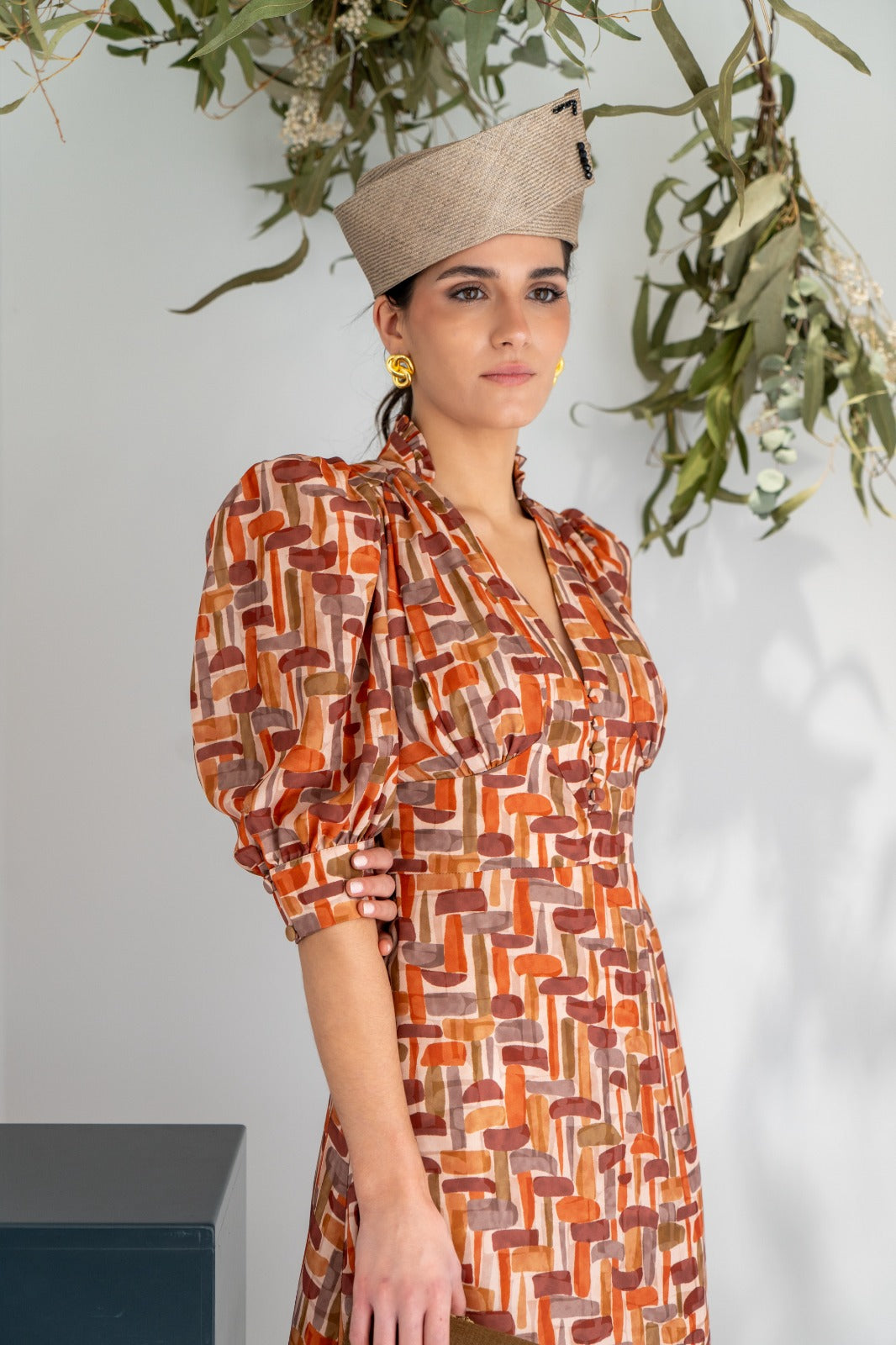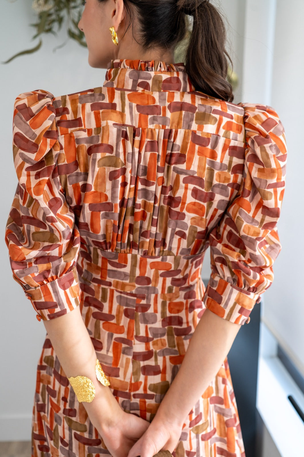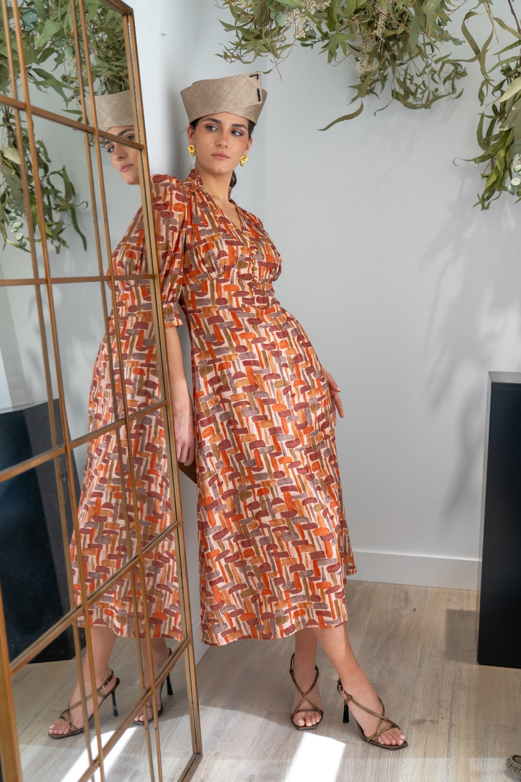 Vestido midi, escote subido terminado en V, detalle botones, manga abullonada terminada en puño, corte en cintura marcada, parte de abajo evase, fluido. En estampado geométrico.