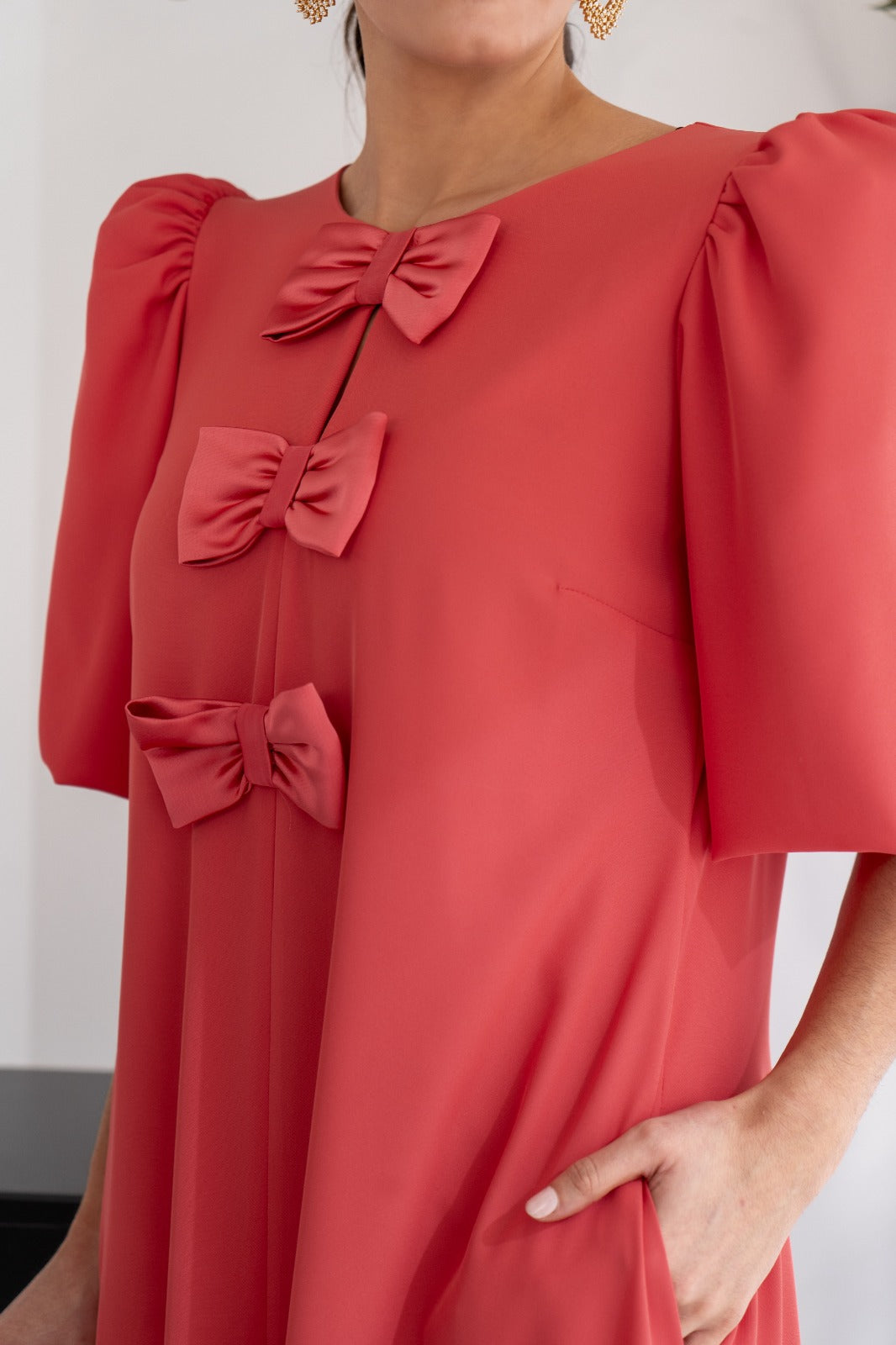 Vestido midi, escote redondo, manga corta ancha, oversize, detalle lazos delanteros, bolsillos, con forma a los lados, abertura delantera. En color coral.