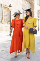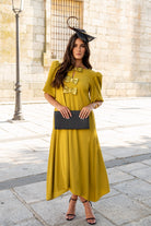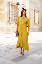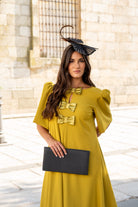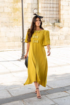 Vestido midi, escote redondo, manga corta ancha, oversize, detalle lazos delanteros, bolsillos, con forma a los lados, abertura delantera. En color oliva.