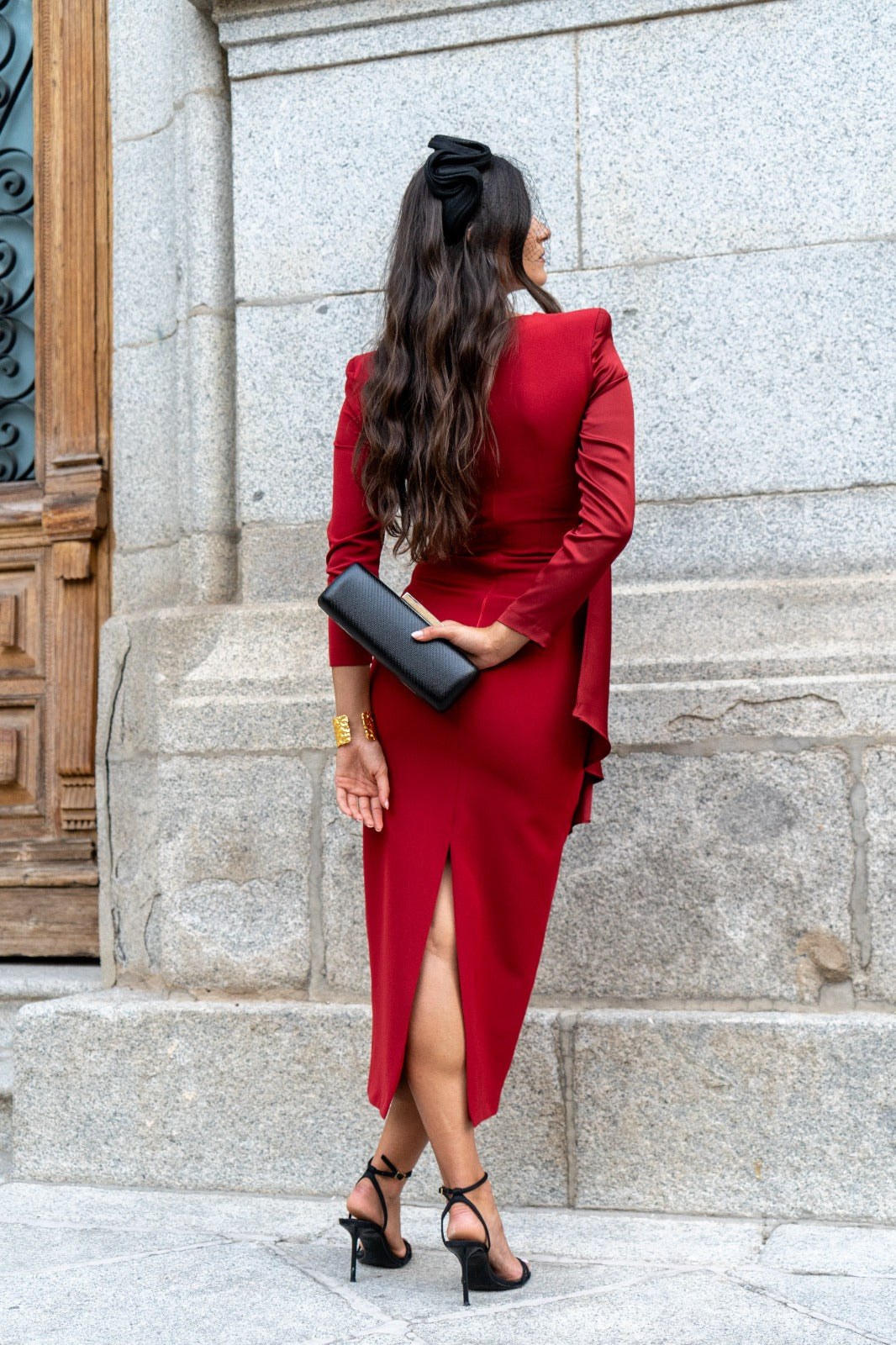 Vestido midi, escote redondo, manga larga, detalle caída raso en un lado, abertura trasera. En color burdeos.