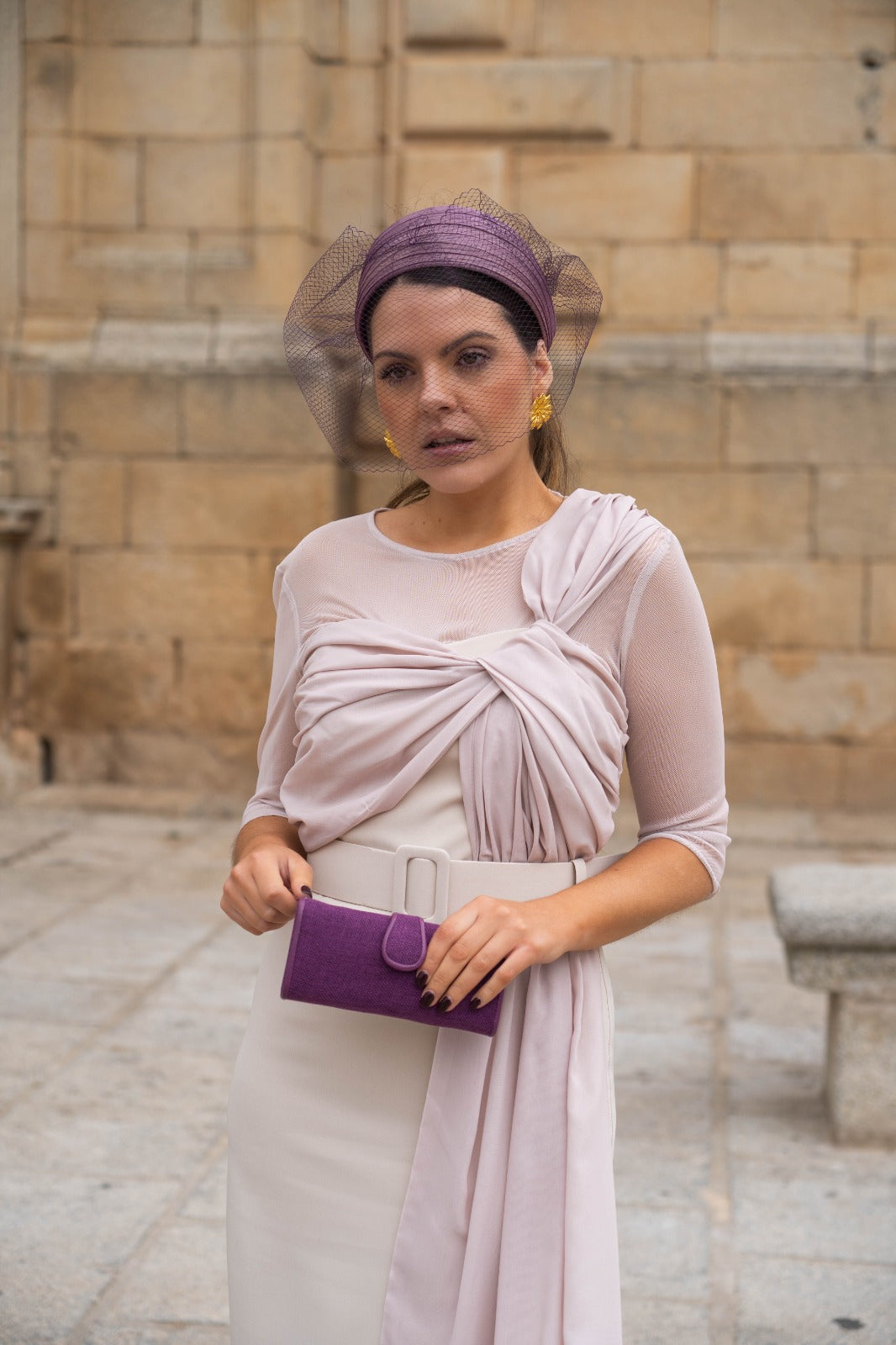 Vestido midi, escote redondo, manga francesa, parte de arriba en gasa con lazo largo en un lado, cinturon incluido, abertura trasera. En color beige.