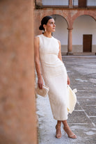 Vestido midi, escote redondo, sin mangas, recto, abertura trasera, capa estructurada con lazo, se puede quitar. En color beige.
