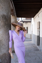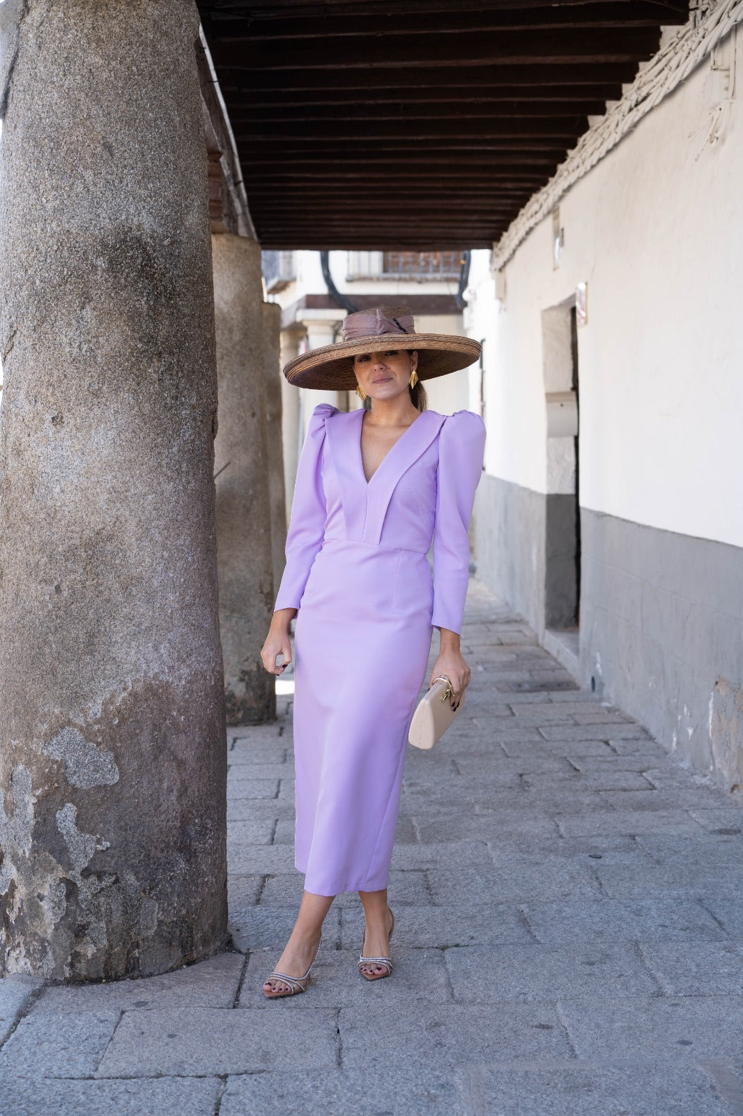 Vestido midi, escote a pico con cuello solapa, manga abullonada, abertura trasera. En color malva.